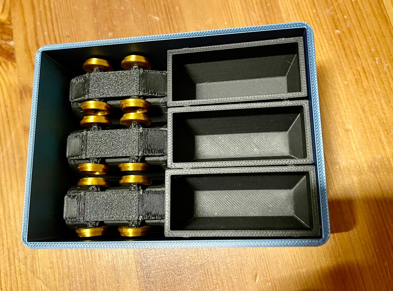 Hộp lưu trữ có nắp cho xe chở than. Chúng tôi nâng cấp trò chơi bàn cờ "My Gold Mine" của KOSMOS bằng hộp này.