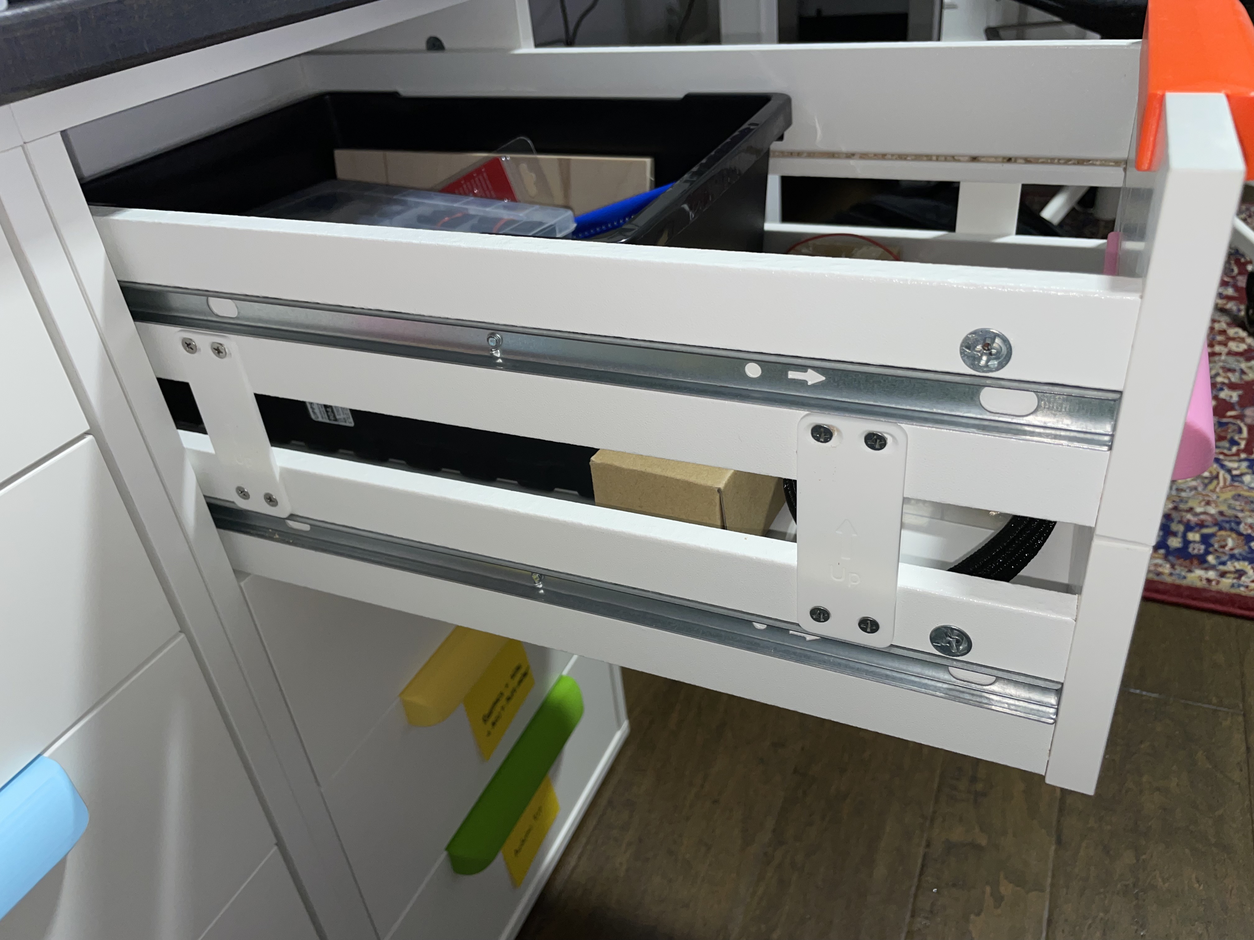 Tôi muốn kết hợp 2 ngăn kéo trên cùng của Ikea Alex thành một ngăn để tăng chiều sâu. Điều này sẽ cho phép cất giữ các vật dụng cao và giúp chúng dễ tiếp cận hơn vì các ray trượt ngăn kéo không trượt hết cỡ. Chúng cũng có thể được sử dụng với bất kỳ 2 ngăn kéo nào khác, nhưng bạn sẽ cần phải tự căn chỉnh chúng. Bạn sẽ cần tối thiểu 2 cái cho mỗi ngăn kéo, nhưng tôi khuyên dùng 4 cái để ngăn kéo được hỗ trợ khi bạn tháo chúng ra khỏi ray trượt vì bất kỳ lý do gì. Khuyến nghị in: 1. Vật liệu - PLA là ổn 2. Độ dày ruột - 15% 3. Vách - 3 4. Vít dùng để gắn: Vít #6, dài 3/8" (M3.5x9.5) Hướng dẫn lắp đặt 1. Sử dụng ray ngăn kéo làm hướng dẫn của bạn. Khoan trước và gắn các lỗ dưới cùng trước. 2. Khoan trước các lỗ trên. Hãy để lại khoảng trống để điều chỉnh giữa mặt trước ngăn kéo trên và dưới. Gắn các lỗ trên. 3. Lặp lại ở các mặt khác. 4. Lặp lại ở mặt sau nếu bạn chọn lắp 4 cái / ngăn kéo. Muốn thêm tay nắm cho ngăn kéo Ikea Alex của bạn? xem bản remix của tôi bên dưới Tay nắm ngăn kéo tủ Ikea Alex - Remix bởi Jazz | Tải mô hình STL miễn phí | Printables.com
