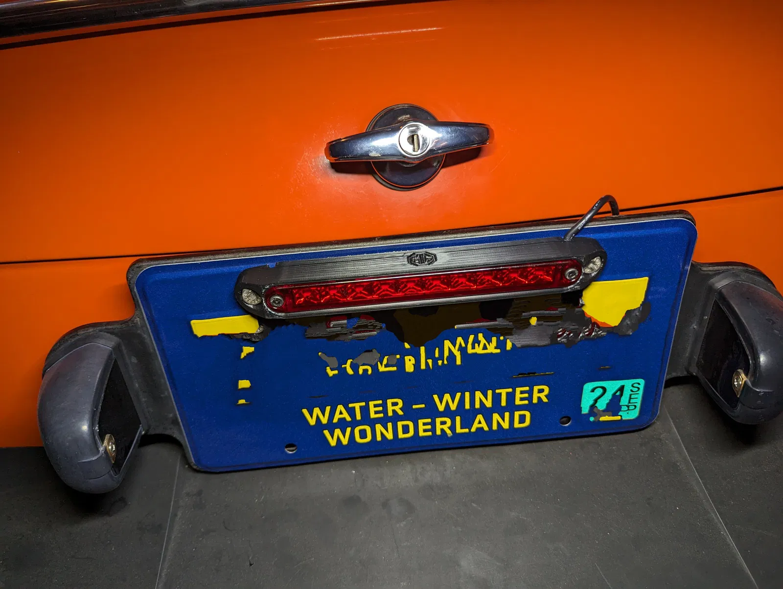 Giá đỡ này dùng hai ốc biển số phía trên để gắn đèn phanh thứ ba. Có hai mặt, một mặt có logo MG. Bạn có thể mua đèn LED trên Amazon và tự đi dây với các phụ kiện đi kèm.