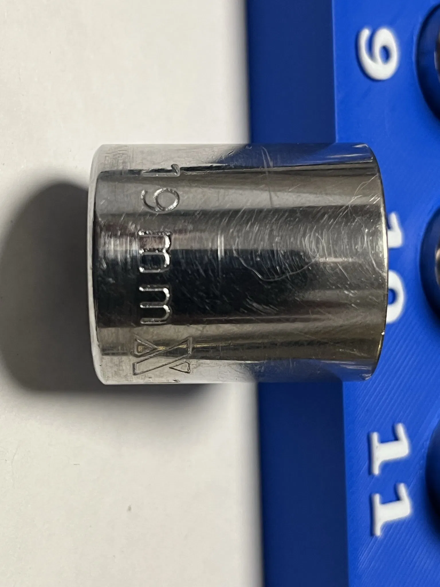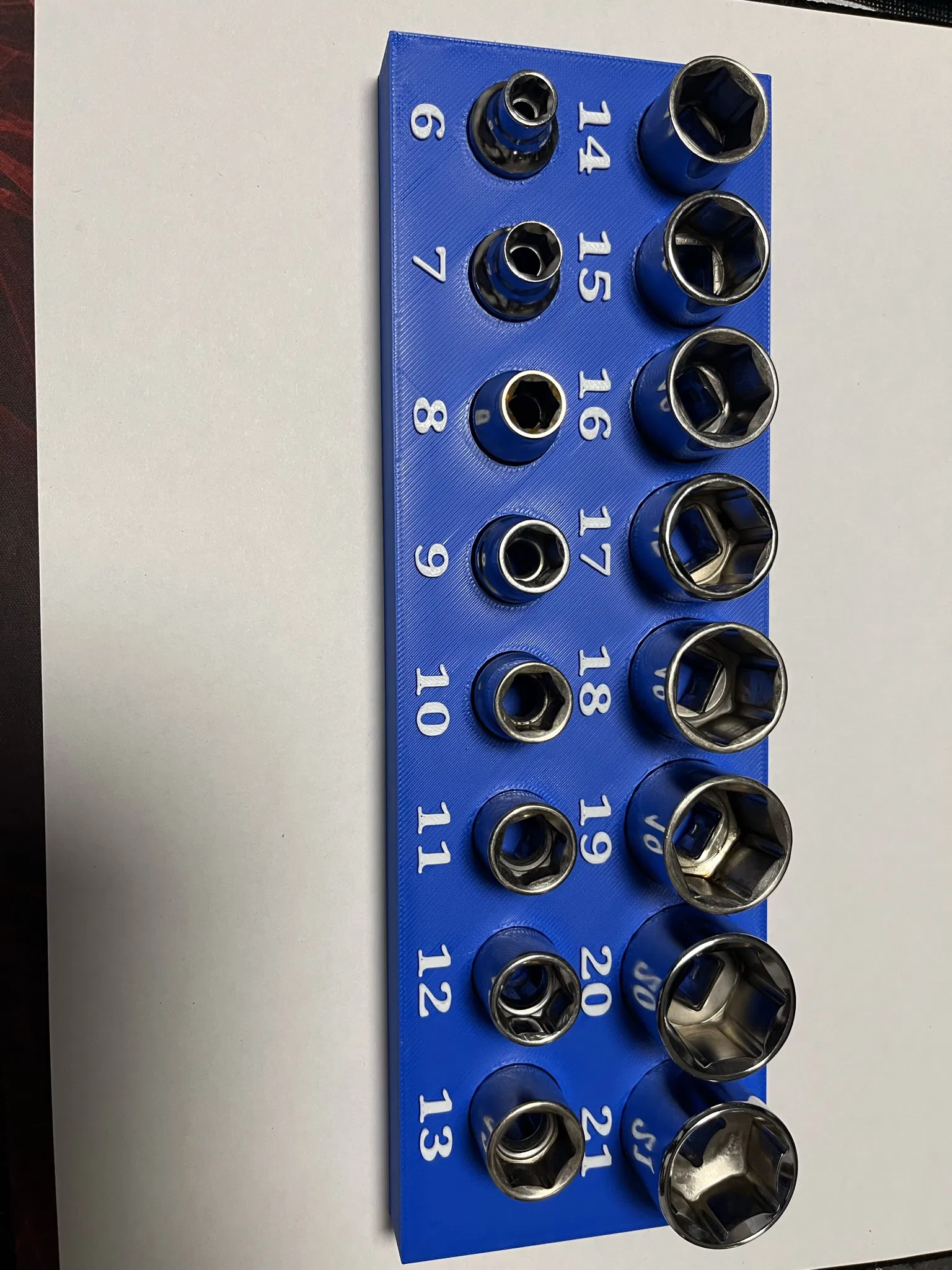 Khay đựng tuýp lục giác hệ mét ngắn, 6 cạnh - Ổ đĩa 3/8 inch - Từ 6mm đến 21mm. In bằng PLA hoặc PET-G với độ đặc ruột 15% và độ phân giải 0.2.