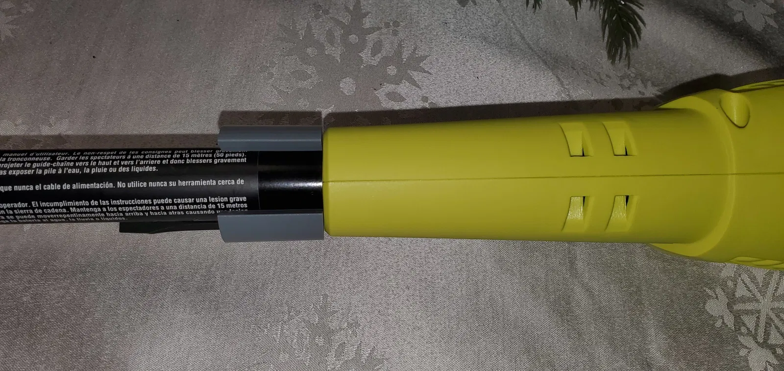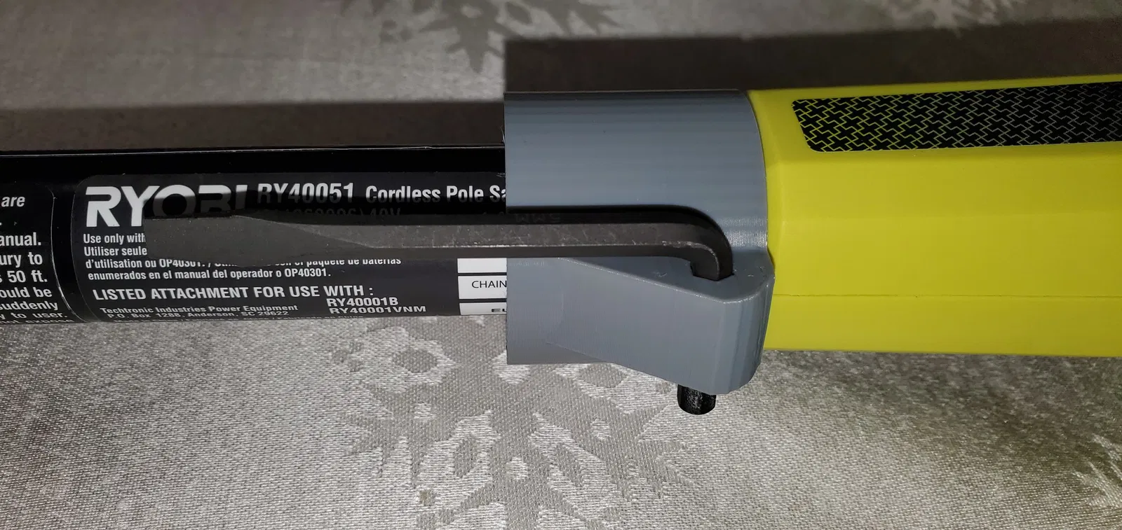 Giải pháp lưu trữ cho cây lục giác dùng để chỉnh độ căng xích trên cưa đa năng Ryobi 40v, model RY40560. Thiết kế kẹp chặt vào đầu cưa để giữ lục giác luôn bên cạnh lưỡi cưa, chống rung rớt khi sử dụng.
