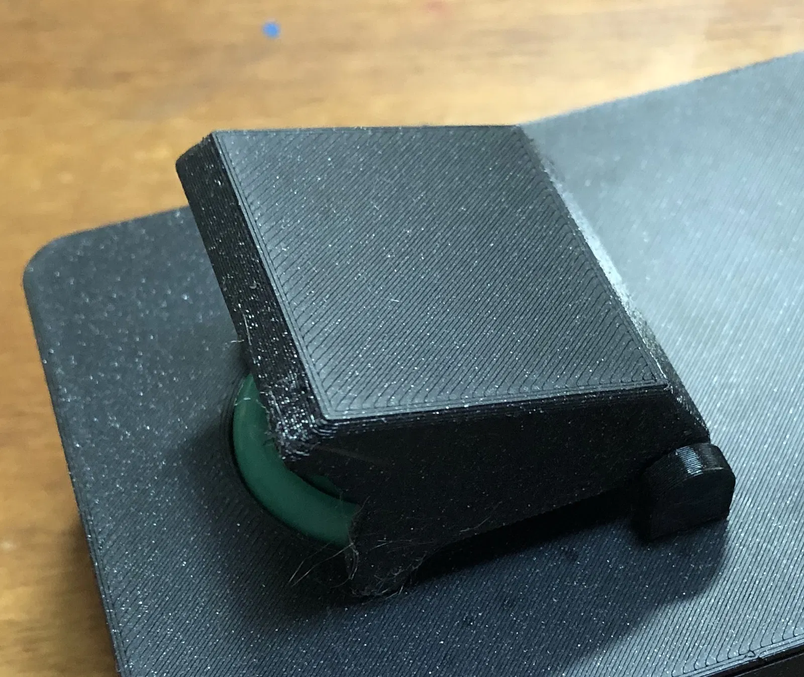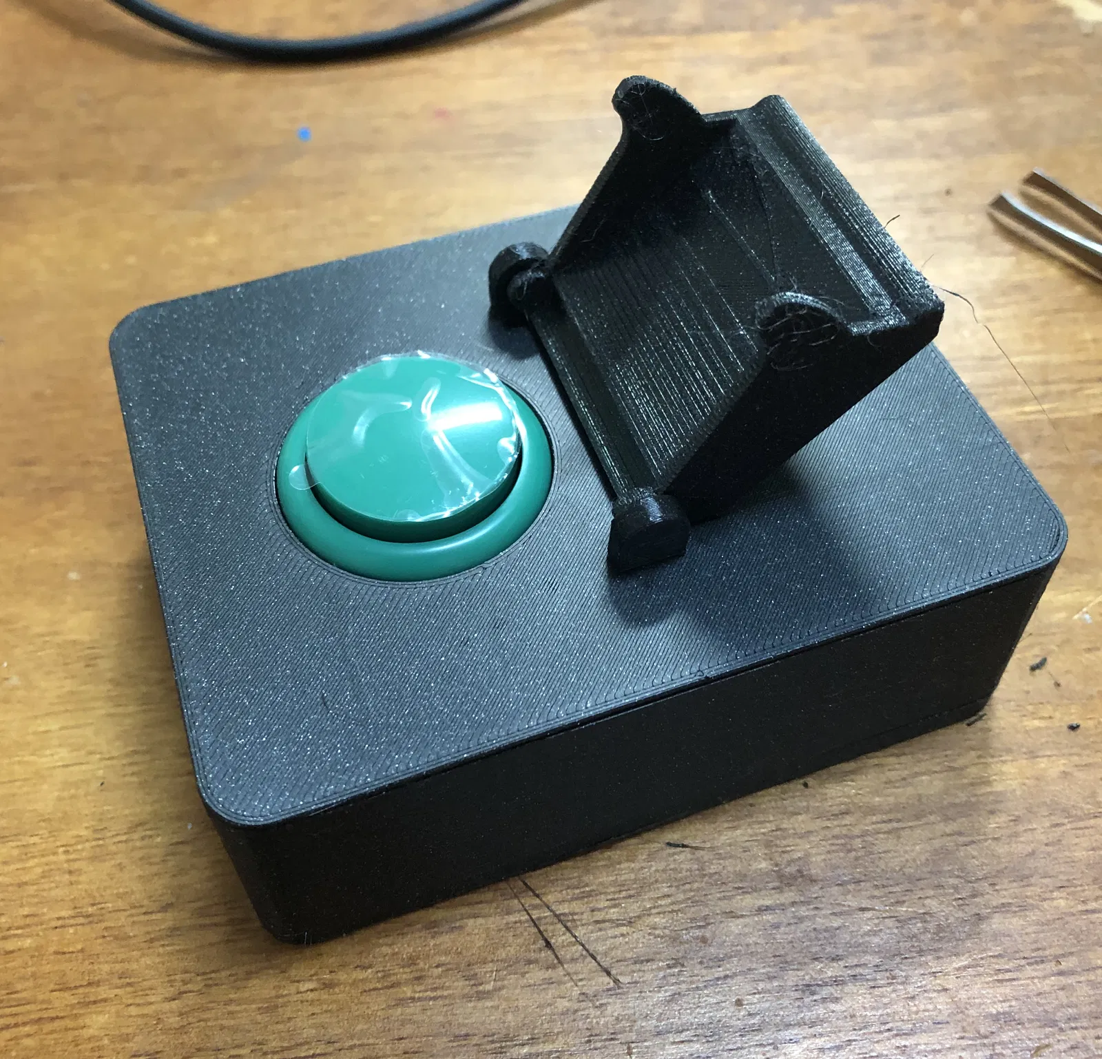 Cái vỏ được tùy chỉnh lại để chứa một breadboard nửa khổ, một nút bấm arcade và một bo mạch Arduino Micro. Lỗ ở mặt sau được đặt ở độ cao của Arduino Micro khi nó được cắm vào breadboard. Lỗ nút bấm vừa với nút bấm arcade tiêu chuẩn và được đặt lệch tâm để chừa chỗ cho nắp nút bấm mở ra. Có một phiên bản mặt trên không có lỗ cho các trụ của nắp nút bấm. Nắp nút bấm kiểu công tắc tên lửa có hai phần: các trụ tạo thành bản lề (in 2 cái) & bản thân cái nắp. Các trụ này gắn vào các lỗ nhỏ trên đỉnh vỏ. Tất cả các bộ phận có thể được dán lại với nhau để có độ khít tốt nhất. Mặt trên của vỏ có thể cần một ít keo để nằm phẳng nhưng keo đủ yếu để có thể tháo ra để tiếp cận bên trong nếu cần (tôi đã dùng keo dính tạm).