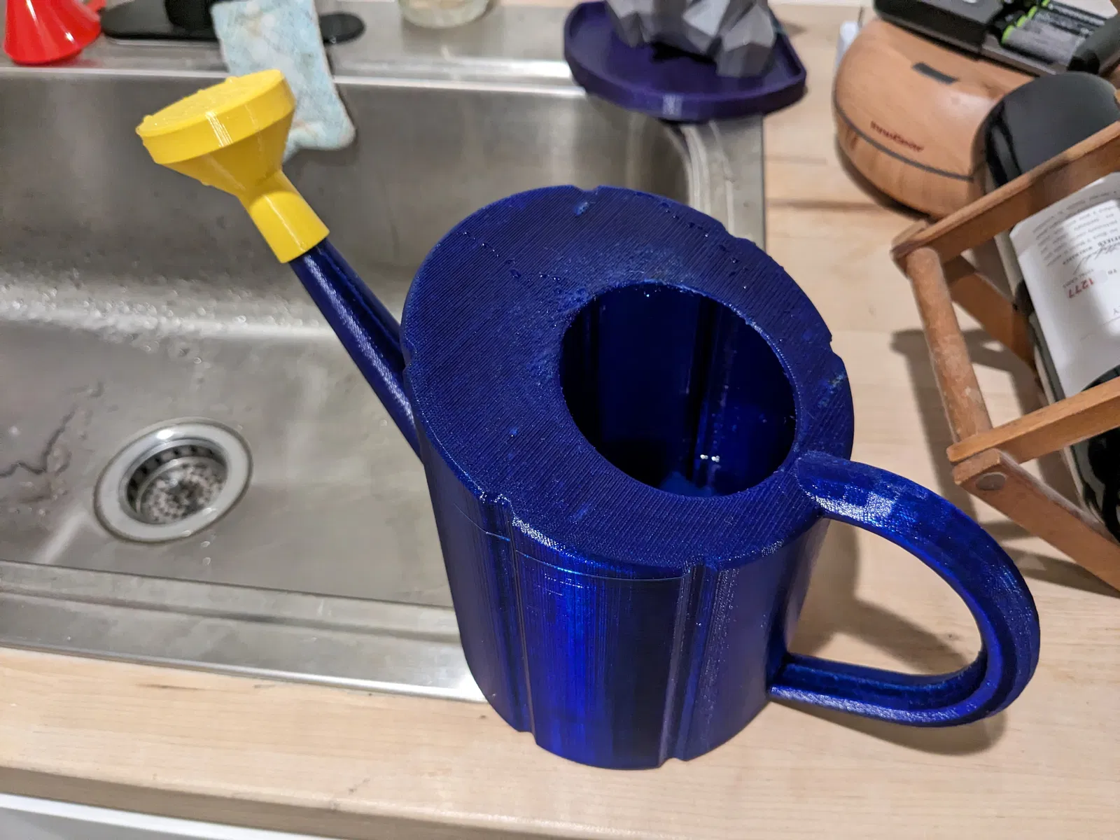 Cái bình tưới cây của @LesKaye thì tuyệt vời rồi. Còn cái đầu phun (rose)? Thì không được ổn cho lắm. Lúc đó tui đang tặng bộ này cho nhỏ bạn và thấy hiệu suất của cái đầu phun làm tui hổng có ưng ý. Thế là tui mới bắt tay vô chỉnh sửa lại. Sau khi làm một phép phân tích nhanh về lưu lượng thể tích và vài cái mẫu thử, tui đã chốt cái thiết kế này. Cái mẫu này có hoàn hảo chưa? Chưa đâu, nhưng mà nó hoạt động đủ tốt cho tui xài và tui cũng không còn thấy ngại khi đem đi tặng nữa.