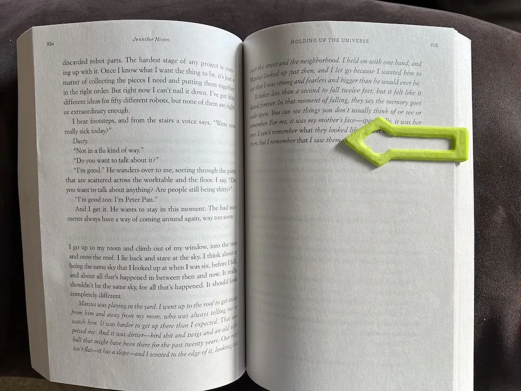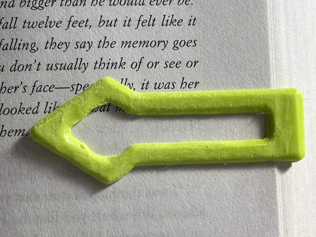 Mẫu kẹp sách hình mũi tên độc đáo, có thể kẹp vào trang sách và chỉ vào đoạn văn bạn đang đọc. In dọc, không cần support, lưu ý dùng brim và in chậm để tránh cong vênh. Thích hợp in với nozzle 0.6mm, layer height 0.3mm.