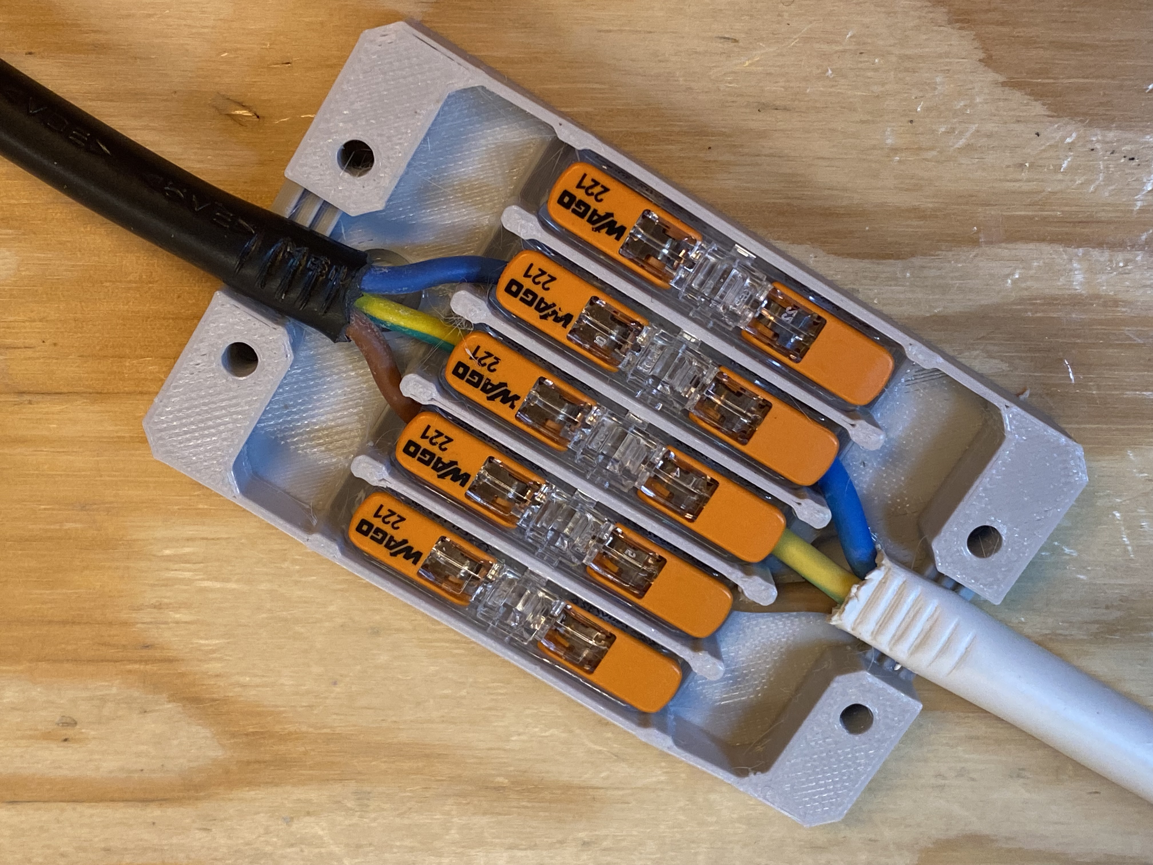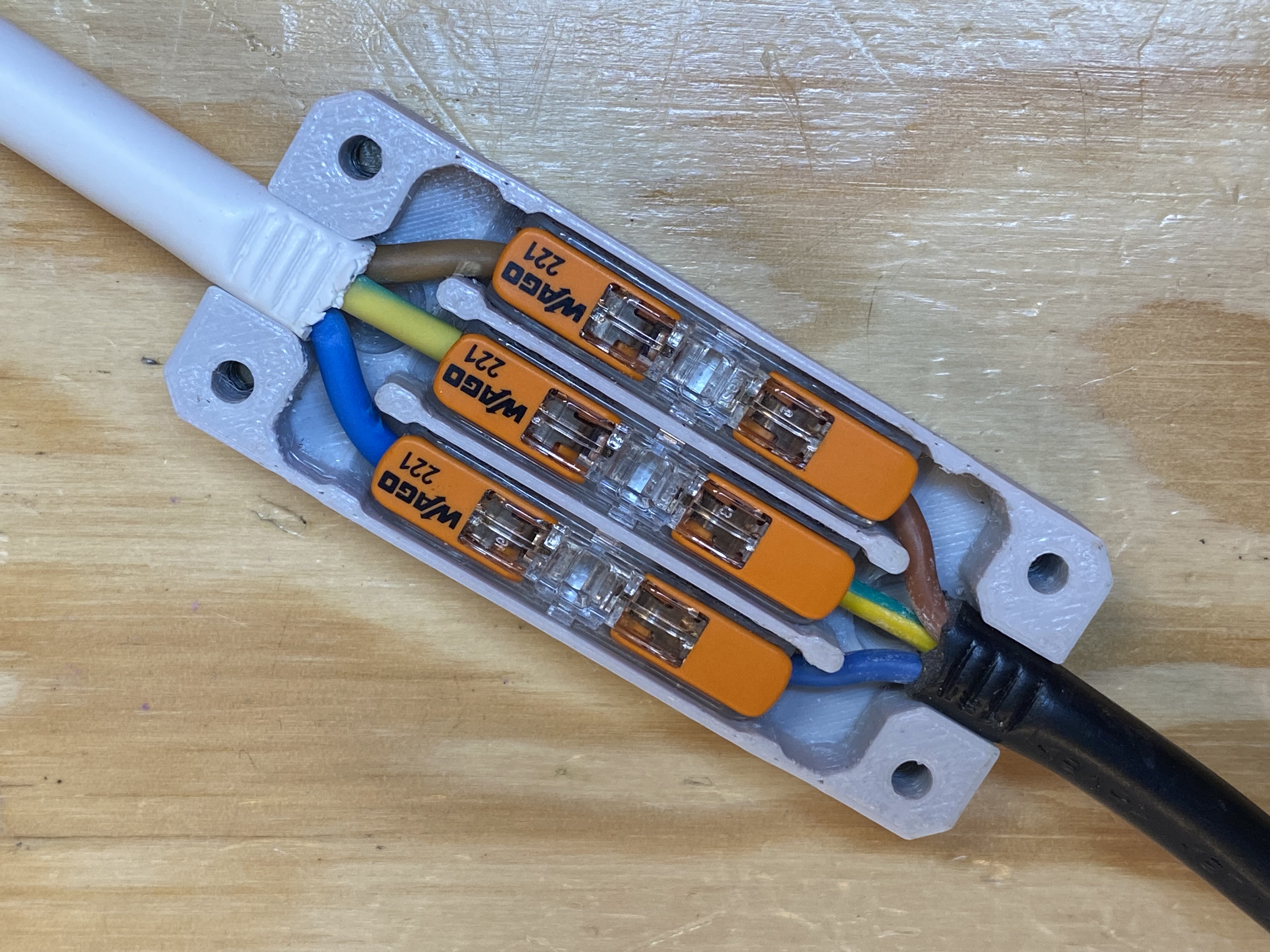 Hộp nối dài cáp cho đầu nối WAGO 221, nhỏ gọn, chống căng cáp tốt và có thể gắn bằng ốc âm. In bằng PETG, dùng ốc M3 để siết chặt.