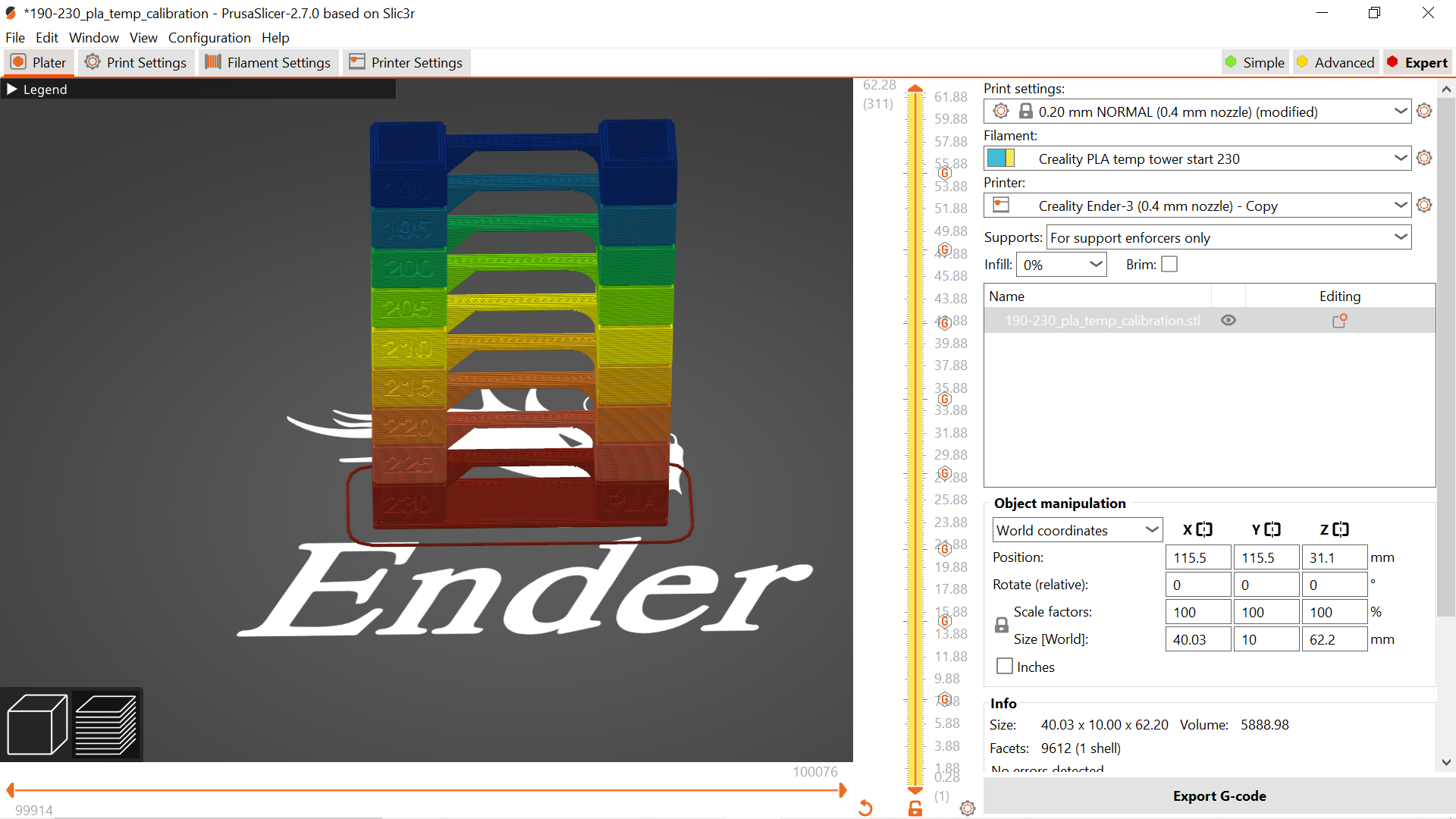 Tháp hiệu chuẩn nhiệt độ PLA điển hình từ 230-190 độ C, được thiết kế đặc biệt để cắt lát cho máy in 3D Ender 3, giúp bạn tối ưu hóa cài đặt nhiệt độ cho bản in PLA của mình.