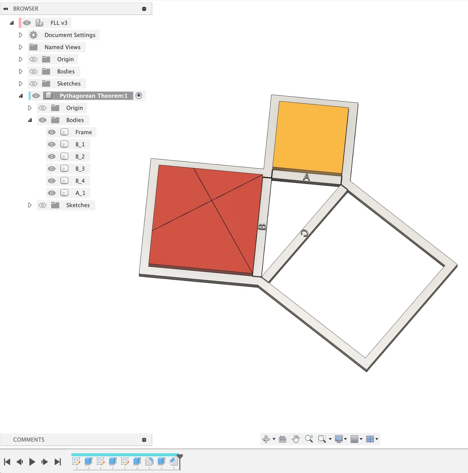 Mô hình có 3 hình vuông trên mỗi cạnh của tam giác. Các mảnh ghép trong hai hình vuông nhỏ sẽ khớp hoàn toàn vào hình vuông lớn nếu Định lý Pytago là đúng.