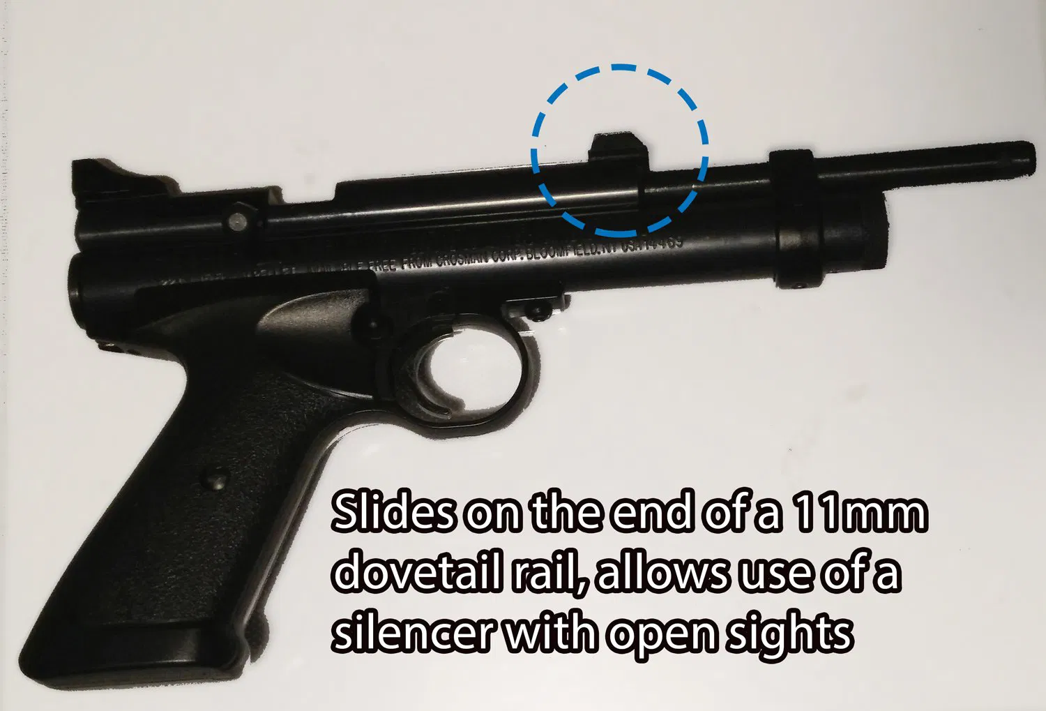 Thiết kế để bắn súng hơi Crosman 2240 với nòng thép, dùng kính ngắm mở khi gắn ống giảm thanh. Làm ngắn bán kính ngắm một chút, nhưng thôi, còn hơn không có kính ngắm!