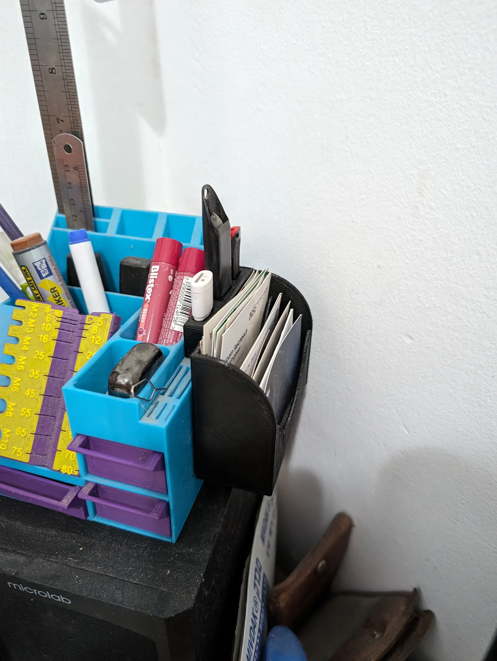 Tôi đã lấy một cái kẹp danh thiếp và tạo một bộ kết nối để thêm vào bộ tổ chức bàn làm việc. Phiên bản này bổ sung thêm một chỗ đựng danh thiếp ở bên cạnh bộ tổ chức gốc, giúp bạn quản lý danh thiếp hiệu quả hơn.