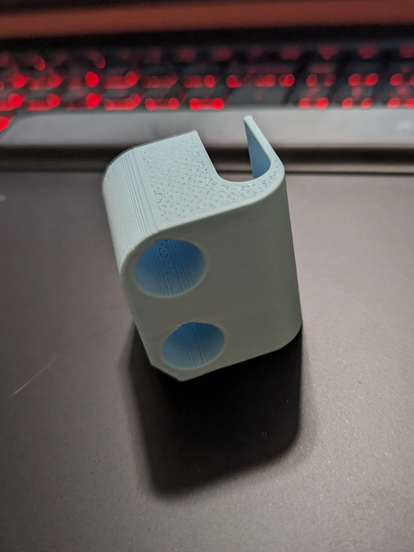 Mấy cái cạnh đáy được vát 30 độ và mấy cái lỗ có cắt hình giọt nước nha. In không cần support vẫn đẹp lắm đó. Cái kẹp của tui đủ cứng để bẻ cong lại hoàn toàn chứ không bị gãy.