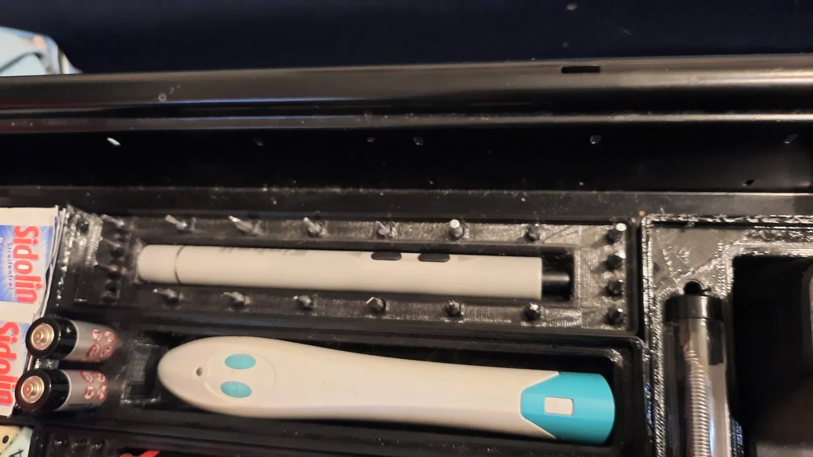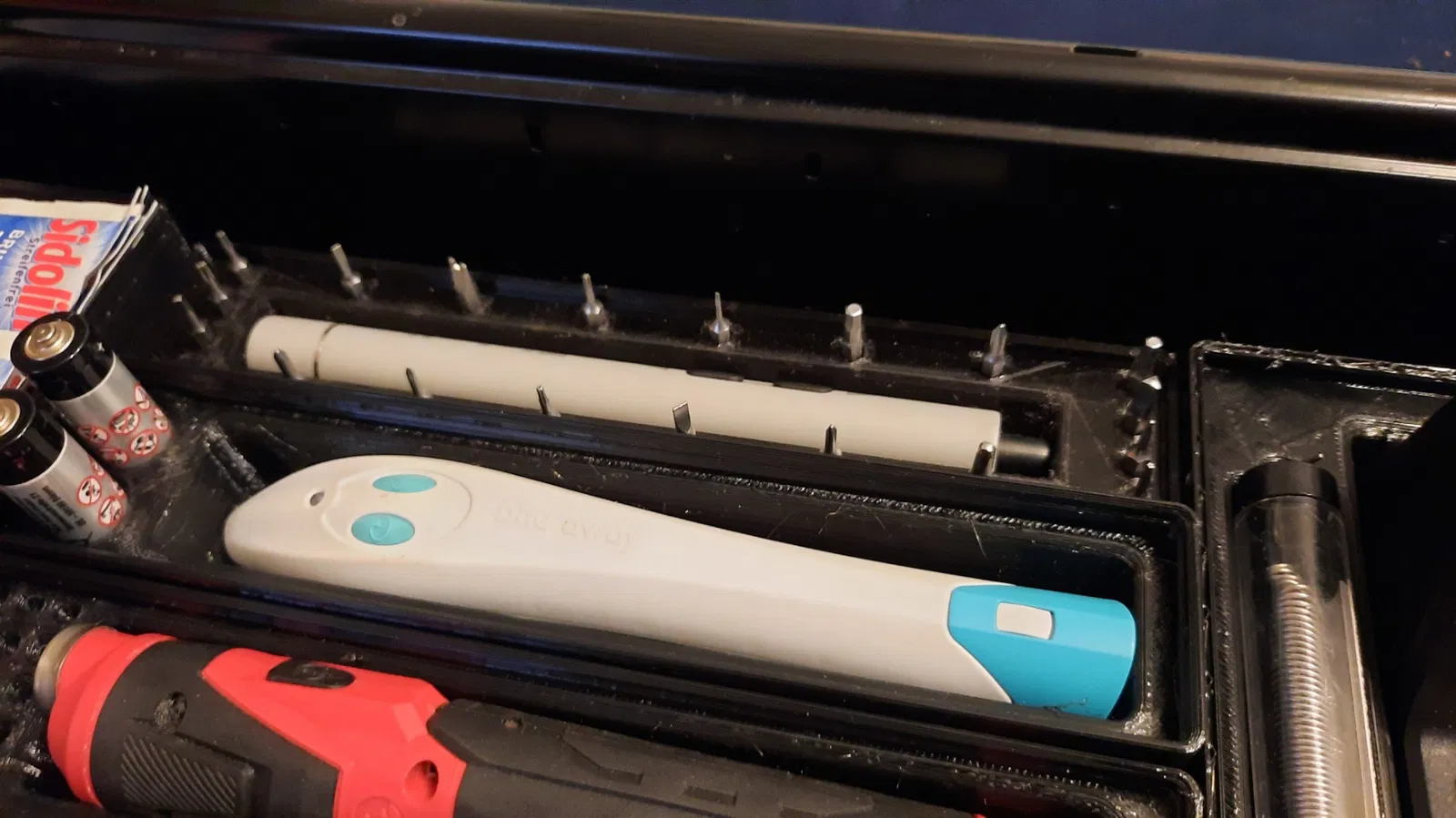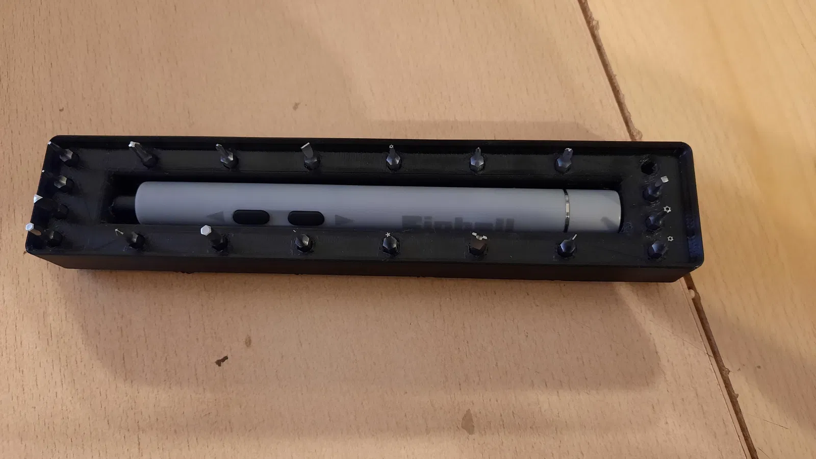 Cái đế này dùng để đựng máy vặn vít pin Einhell và các đầu vặn đi kèm, tích hợp vào hệ thống Gridfinity. Kích thước 1x5 ô, in bằng Petg.