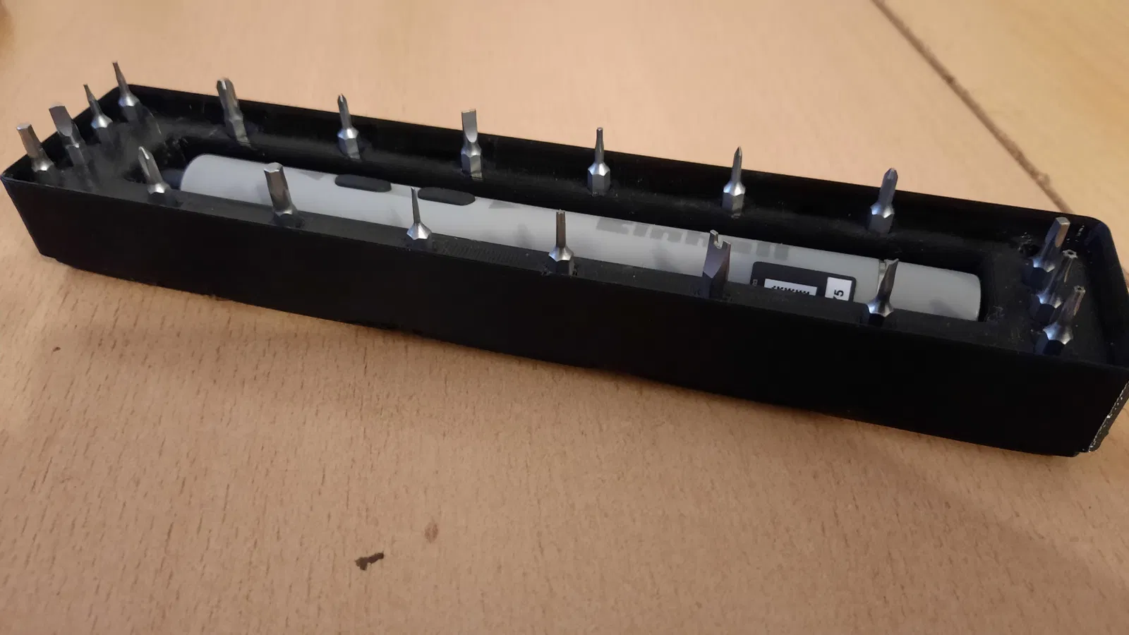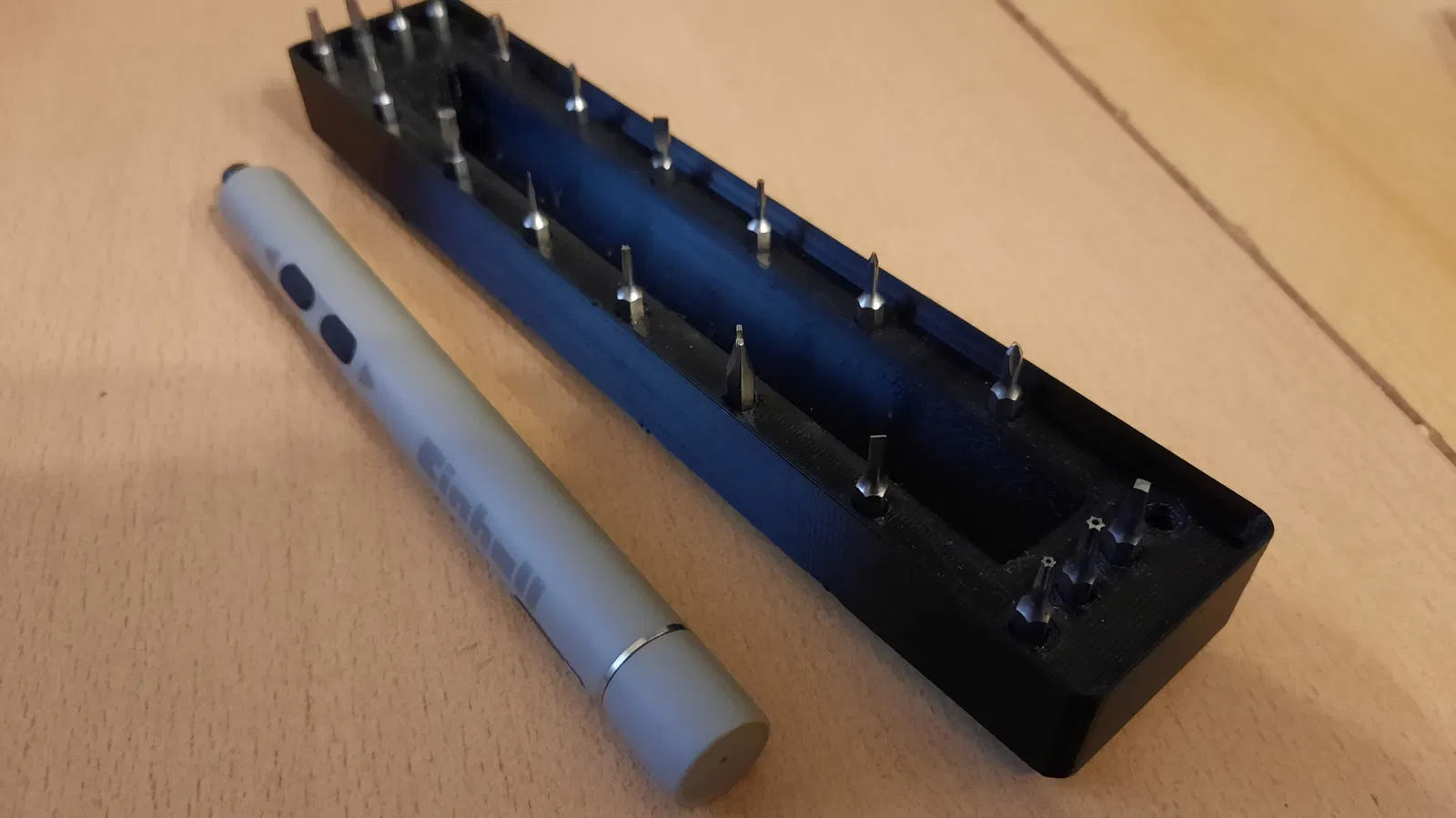 Cái này là cái đế giữ cho máy vặn vít dùng pin Einhell và mấy cái đầu vặn đi kèm, theo hệ thống Gridfinity nha. Kích thước là 1x5 ô Gridfinity, in bằng Petg với chiều cao lớp là 0.3 và đầu phun 0.4.