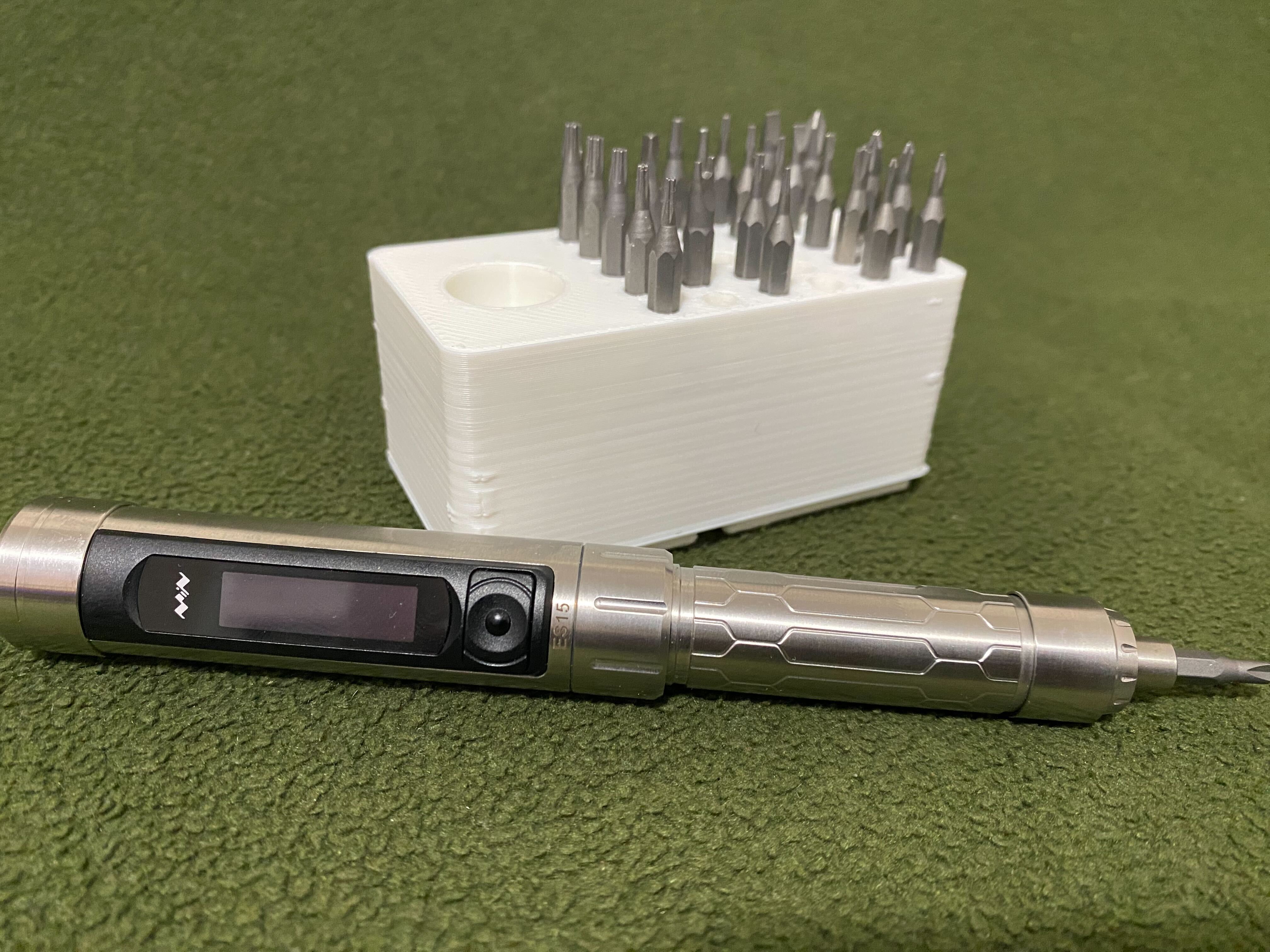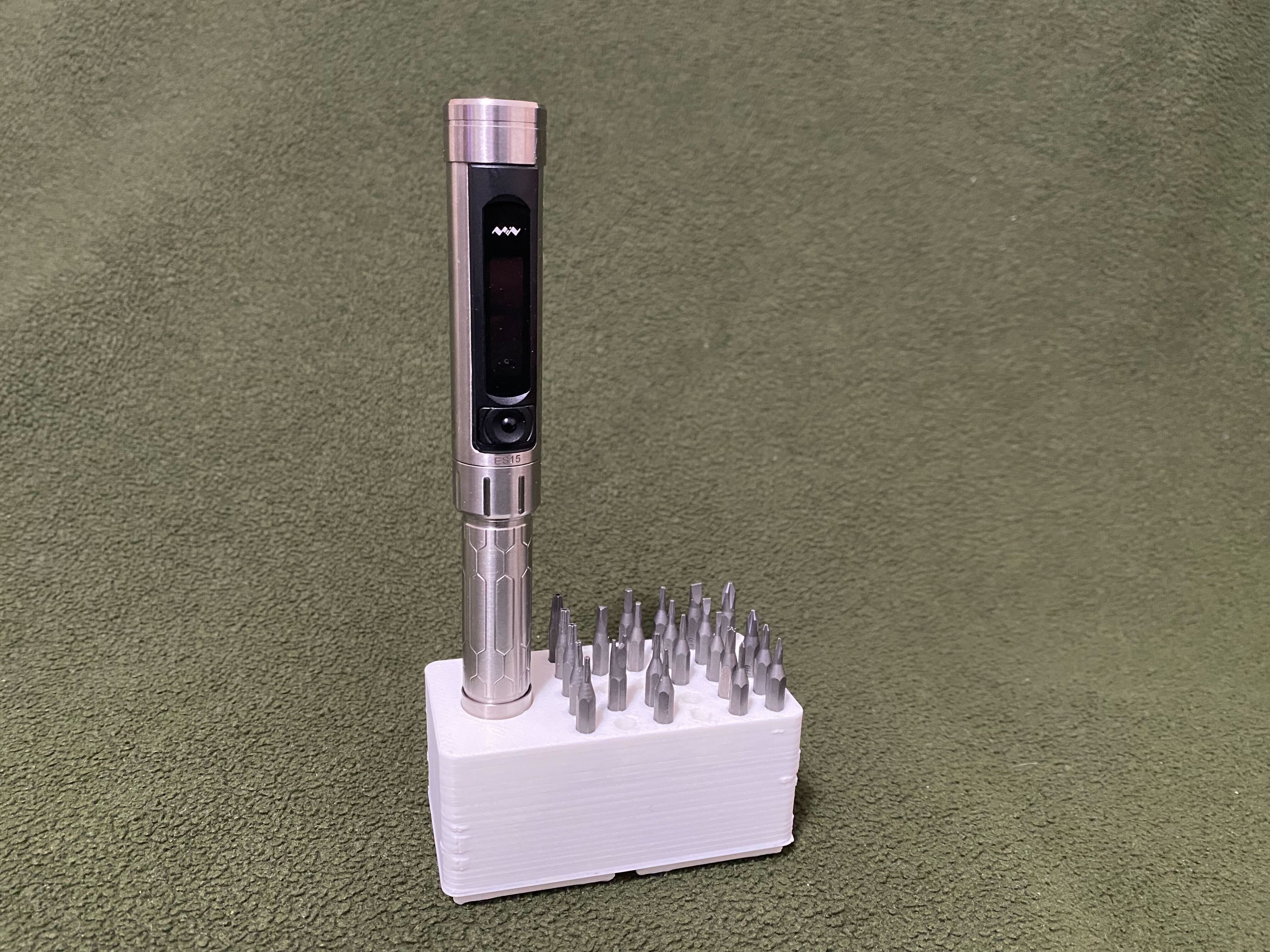 Dụng cụ giữ Gridfinity nhỏ gọn, dựng đứng, dành cho tua vít ES15 và 30 mũi khoan 4mm. Có hai mẫu, một mẫu có đế và một mẫu không có đế (tôi thường in đế riêng rồi dán lên). Dụng cụ giữ này cao 4U để có thể lưu trữ kèm mũi khoan đã lắp vào tua vít cho tiện.
