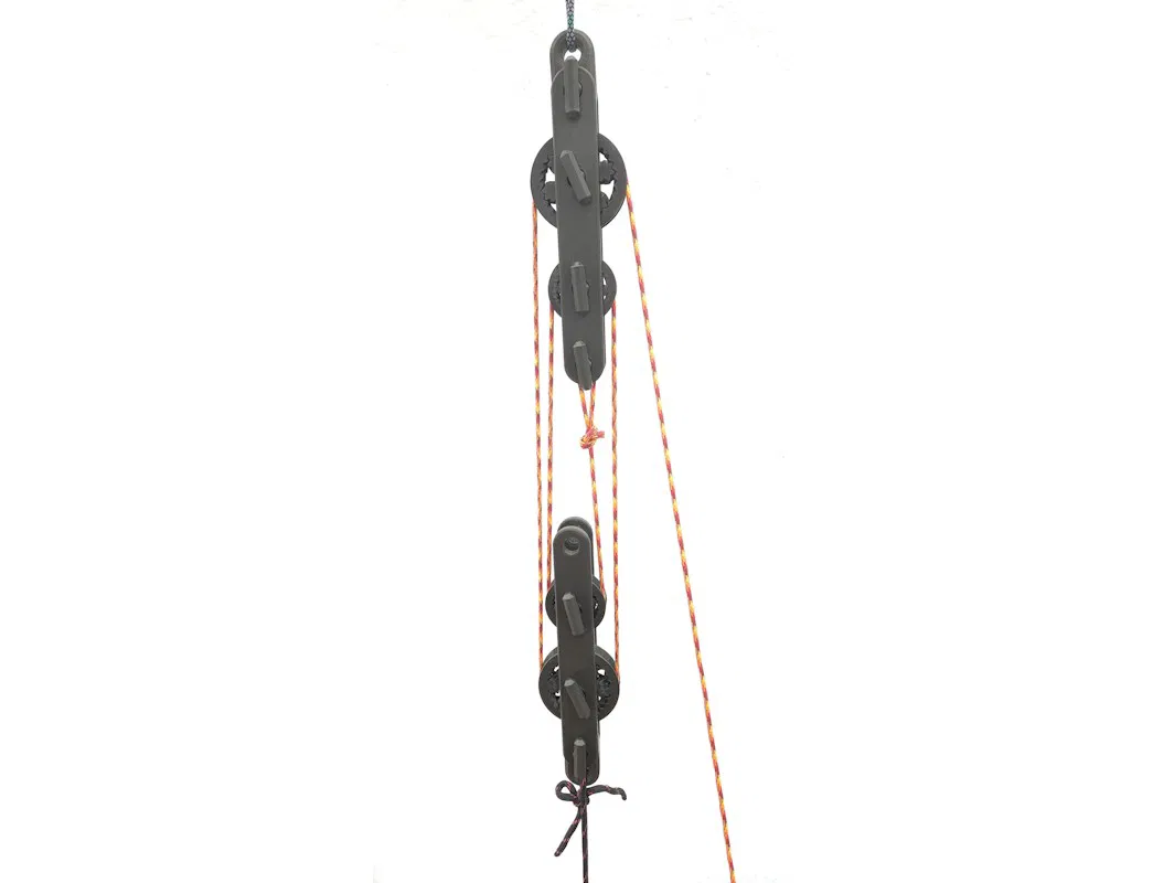 Tôi đã tạo một thiết kế đồng phẳng (tất cả các ròng rọc trong cùng một mặt phẳng) tương ứng với các bản vẽ điển hình. Sử dụng tất cả các ròng rọc (như trong hình) nó có lợi thế lý thuyết là 4:1. Tuy nhiên, việc nâng một tải 15kg đòi hỏi một lực tương đương 5,1kg, vì vậy ma sát trong 4 ròng rọc làm giảm lợi thế hiệu quả xuống còn 3:1 (để giữ nguyên vị trí hoặc hạ chậm, cần lực thấp hơn). 15kg không hề cảm thấy gần giới hạn, vì vậy tôi đoán nó có thể xử lý thêm một chút tải trọng.