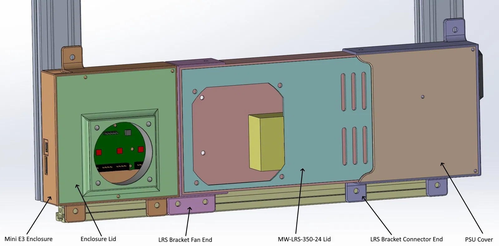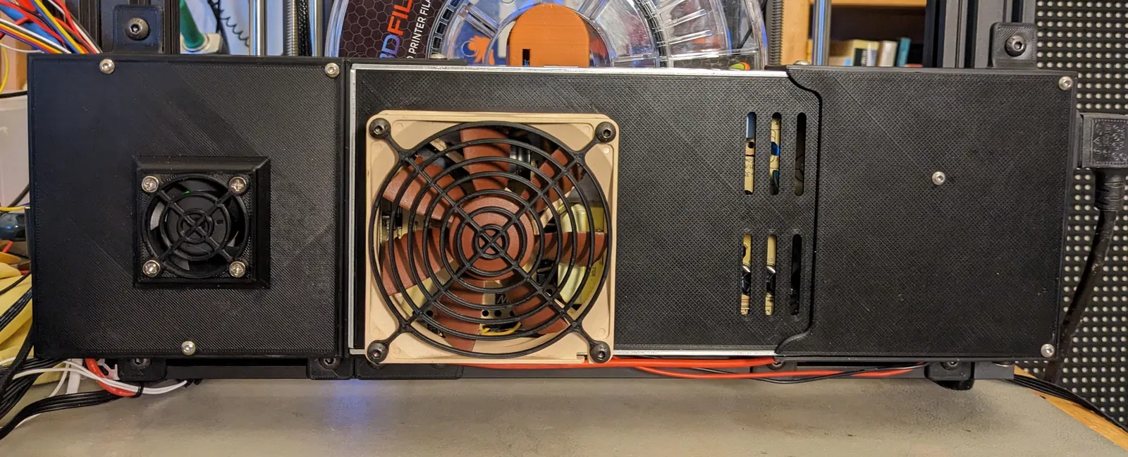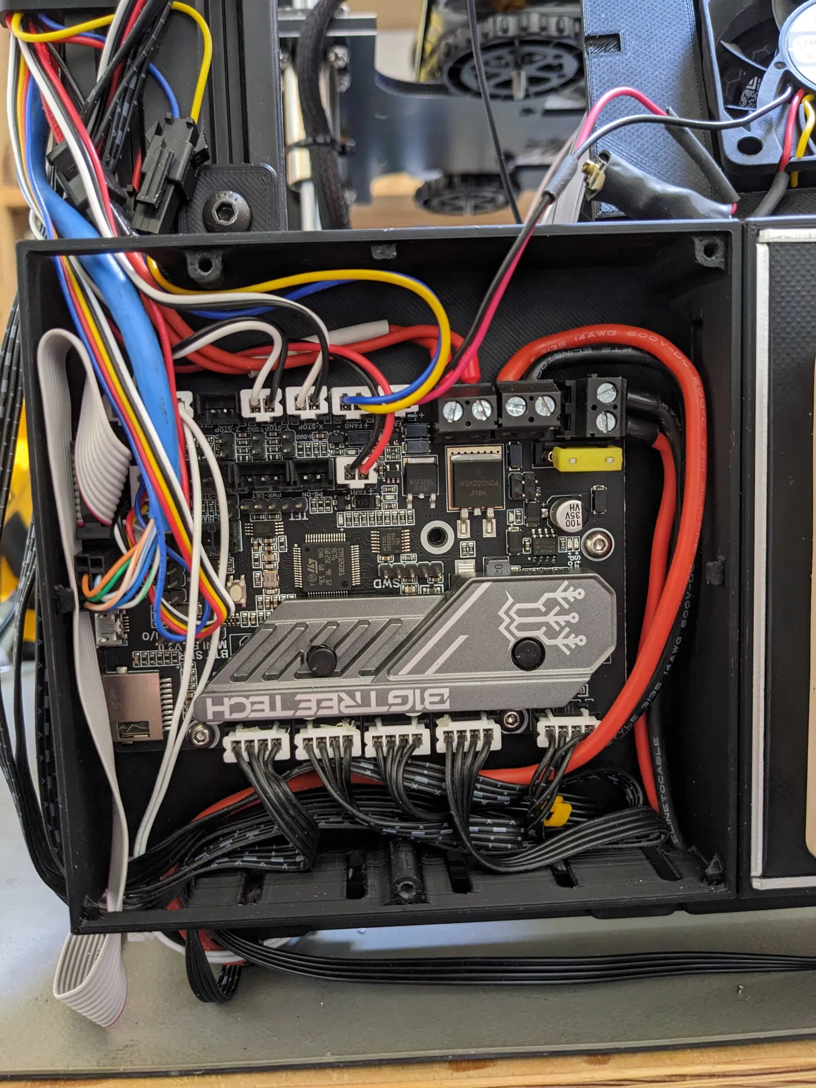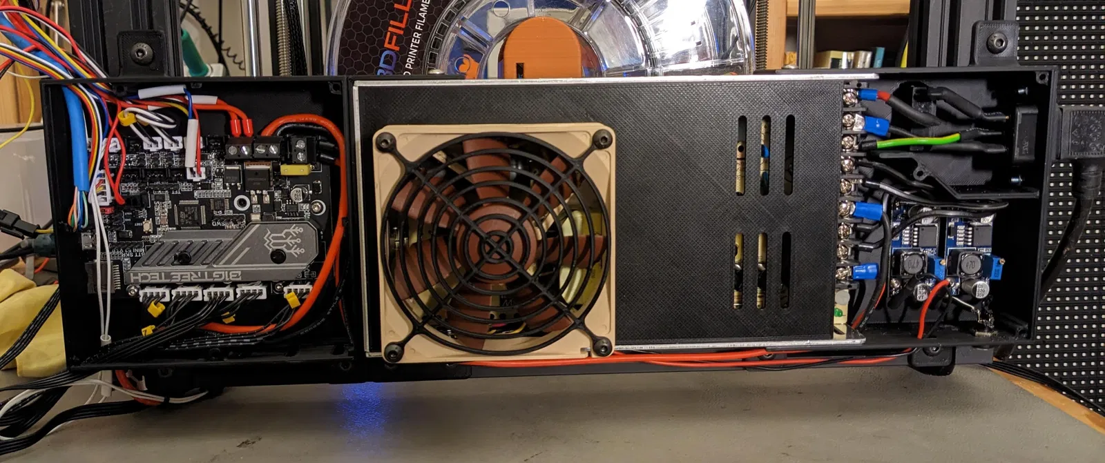 • Quạt 60mm trong nắp che bộ nguồn sẽ treo xuống gần bo mạch chủ. Khoảng trống này đủ cho SKR Mini E3, nhưng hãy kiểm tra kỹ nếu bạn đang sử dụng bo mạch chủ khác.