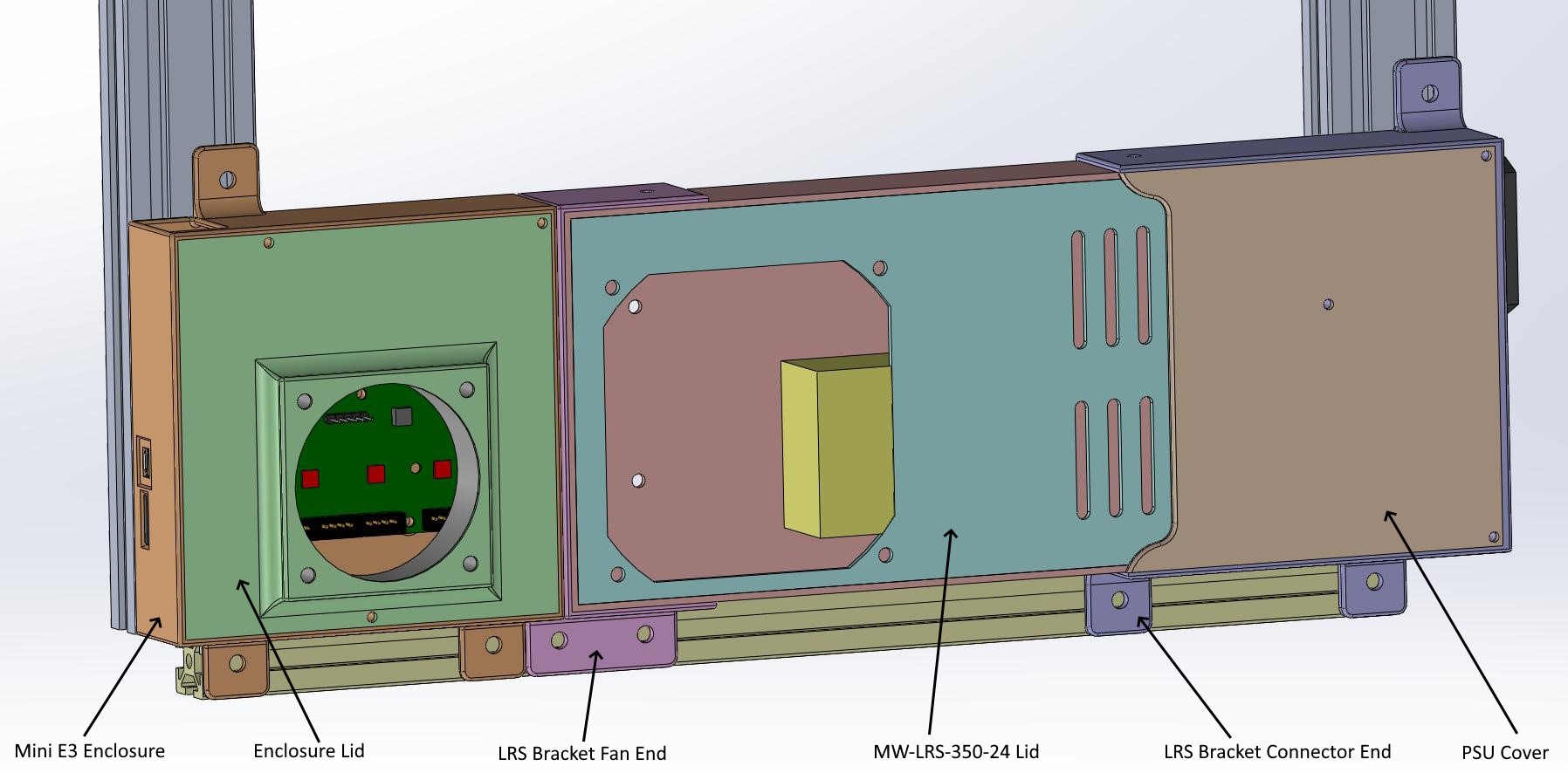 - Bộ nguồn Mean Well LRS-350-24. Các lỗ gắn của bộ nguồn khác có lẽ cũng có vị trí tương tự và tương thích.