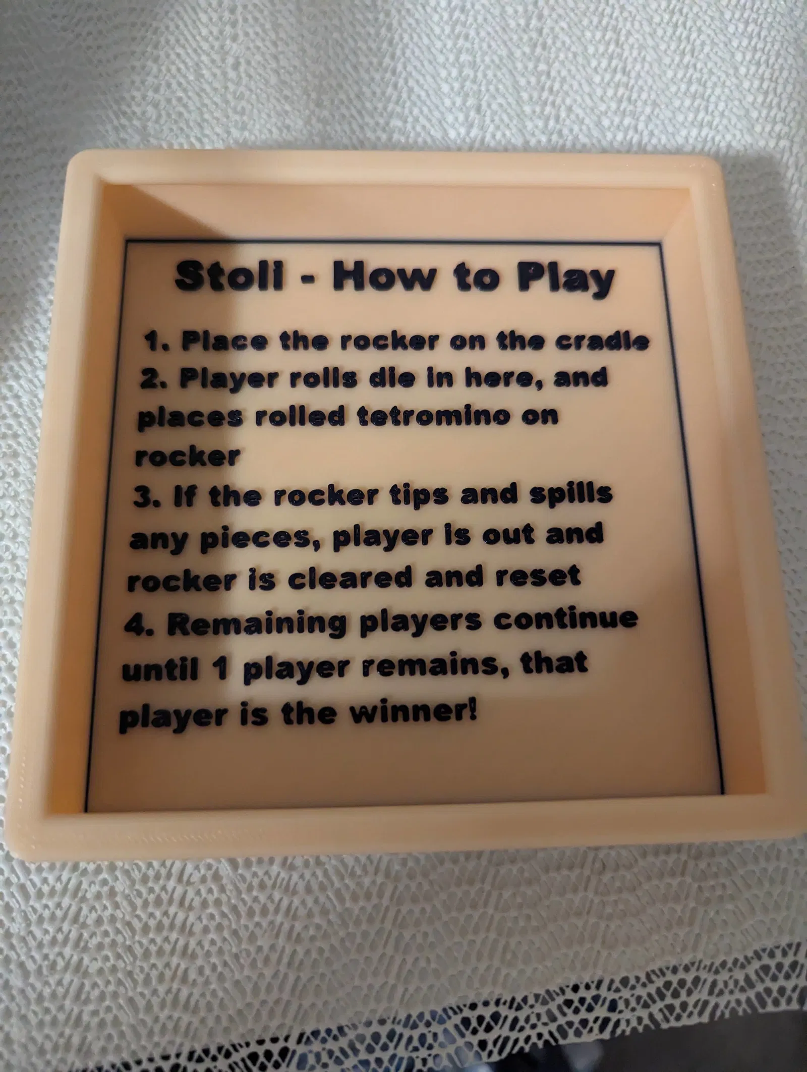 Cái này cung cấp hướng dẫn cho người dùng cách chơi Stoli, và một chỗ để thả xúc xắc vào bên trong để xúc xắc không bị lăn ra khỏi bàn. Đây là một phụ kiện tuyệt vời cho Stoli, khi tặng Stoli làm quà, vì nó cung cấp cho người nhận những chỉ dẫn rõ ràng về cách chơi Stoli mà không cần phải tra cứu trên mạng. Tôi đã sử dụng cách diễn đạt của Bryan Vines cho phần văn bản “cách chơi”, nhưng tôi đã rút ngắn một số phần để giảm bớt lượng văn bản cần in. Ngoài ra, cái này hoạt động tốt hơn nếu bạn chuyển màu/chất liệu in ở các lớp có chữ. Tôi đã sử dụng Bambu Labs AMS để làm điều này, nhưng bạn cũng có thể tạm dừng và đổi chất liệu in thủ công ở lớp phù hợp để nó hoạt động.