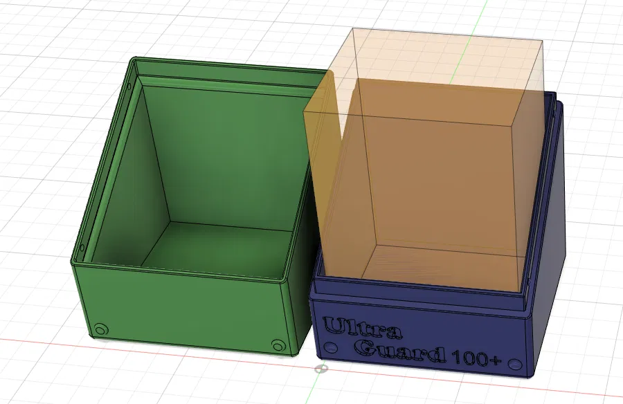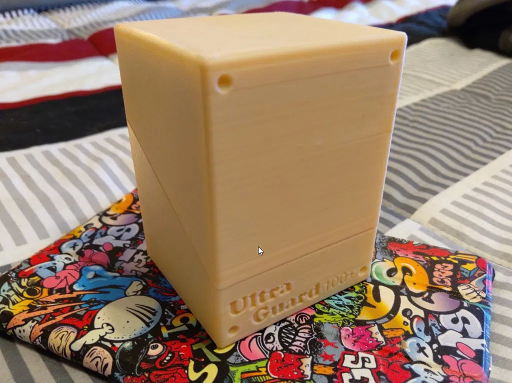 Đây là phiên bản "Ultimate Guard 100+" hộp đựng bài của tui. Tui đã dùng Fusion 360 để tự xây dựng phiên bản của mình từ đầu. Hộp đựng bài này có thể chứa 100 lá bài magic the gathering đã được bọc và thêm vài lá nữa (như một nắm token). Tui có thêm các chân đế nhỏ và phần lõm để có thể xếp chồng lên nhau. Cách dễ nhất để mở kiểu hộp này là để chữ hướng lên và cạy nó ra như bạn cạy trứng vậy. Tui rất mong nhận được góp ý... Cũng nếu bạn làm hoặc làm lại, xin hãy chia sẻ kết quả của bạn. Cái này được tạo ra để đáp lại hộp đựng bài 60+ lá của tui. Mọi người muốn một phiên bản cho Commander. Xin lỗi vì tui đã mất nhiều thời gian để phát hành cái này. Ultra Guard 60+ - ### Cài Đặt In Thương hiệu máy in: Monoprice Máy in: Select Mini Rafts: Không Supports: Không Độ phân giải: .2mm Infill: 15% Filament: Generic PLA Bất kỳ * Nếu bạn thích tác phẩm của tui, bấm trái tim và cho tui một like, nếu bạn thích tác phẩm của tui, xin hãy đánh giá nó bằng các ngôi sao ở trên và viết vài lời.. Nếu bạn làm tác phẩm của tui, xin hãy đăng một lượt làm và/hoặc bình luận về nó.. Sự ủng hộ của bạn được trân trọng!