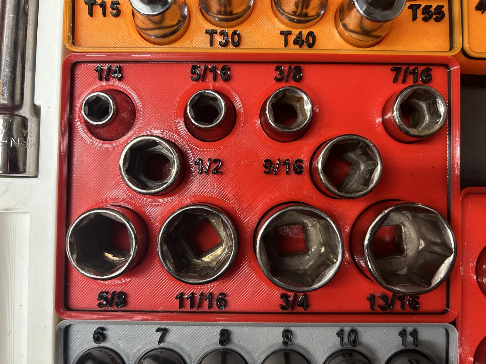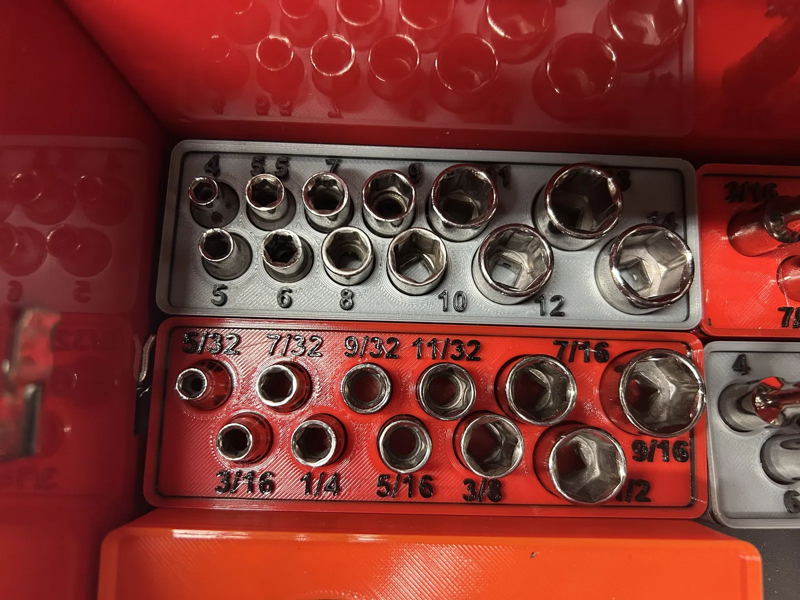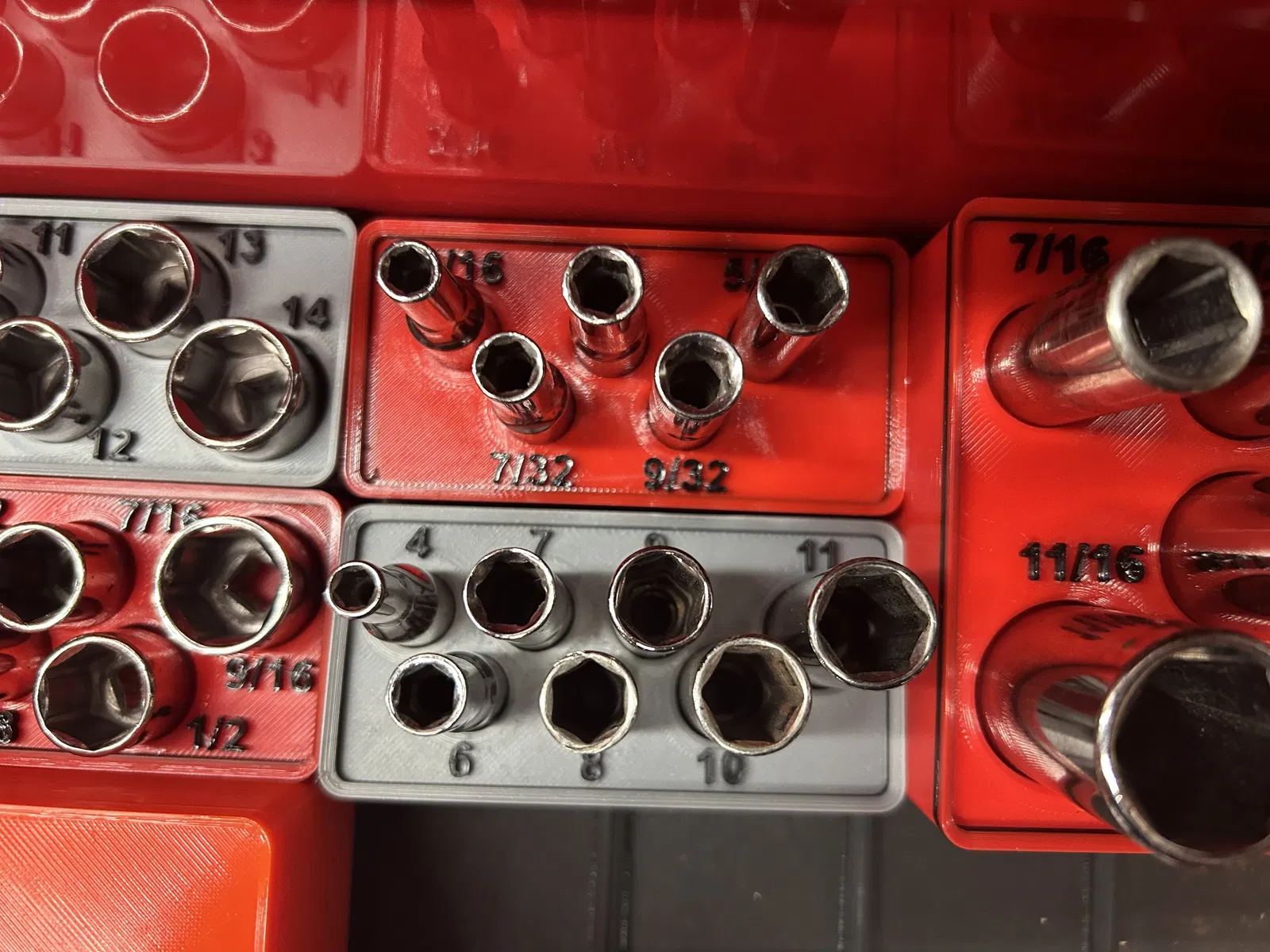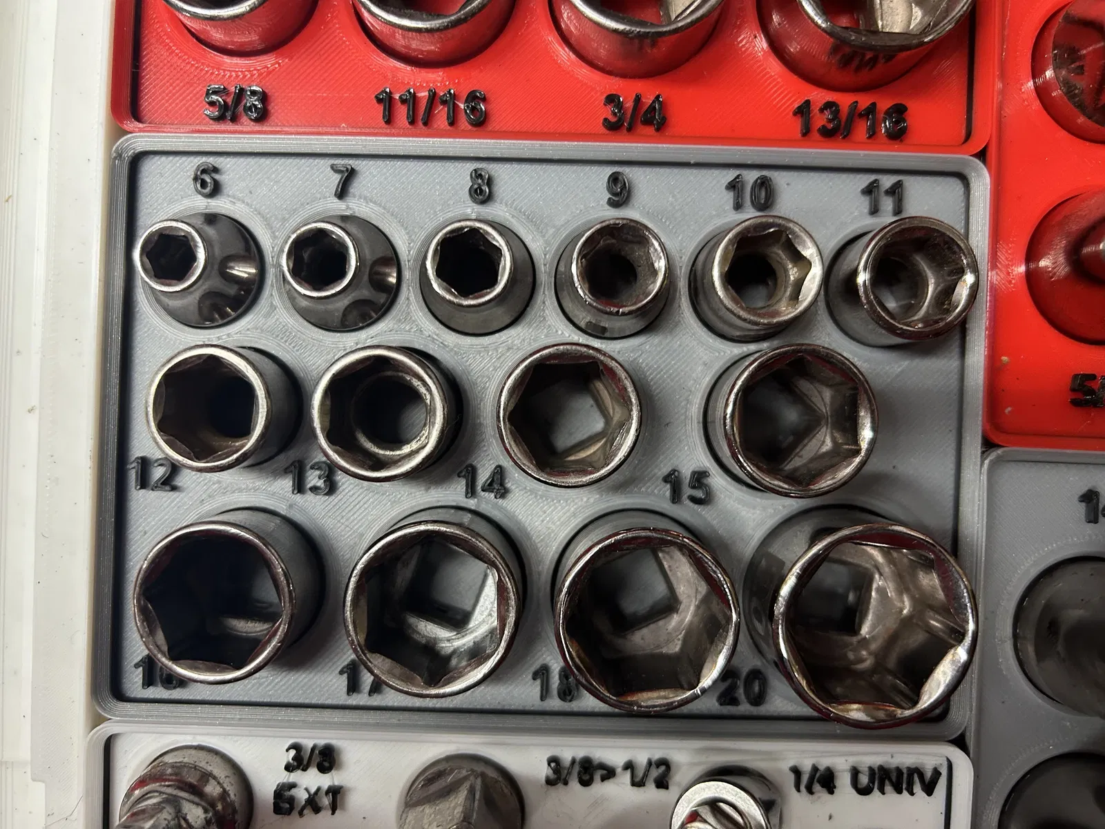 Bộ khay đựng các loại tuýp khẩu của Craftsman và Pittsburg, thiết kế theo chuẩn Gridfinity. Phù hợp cho các cỡ tuýp 1/2", 3/8", 1/4" và cả các phụ kiện như đầu nối, khớp nối, tay vặn. Giúp sắp xếp dụng cụ gọn gàng, dễ tìm.