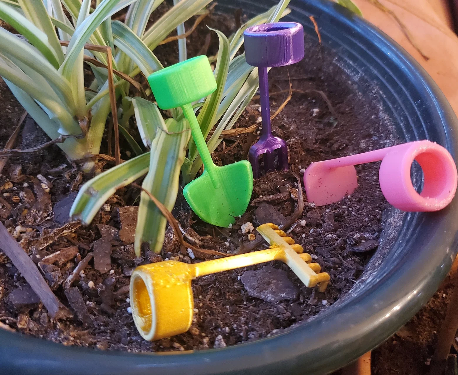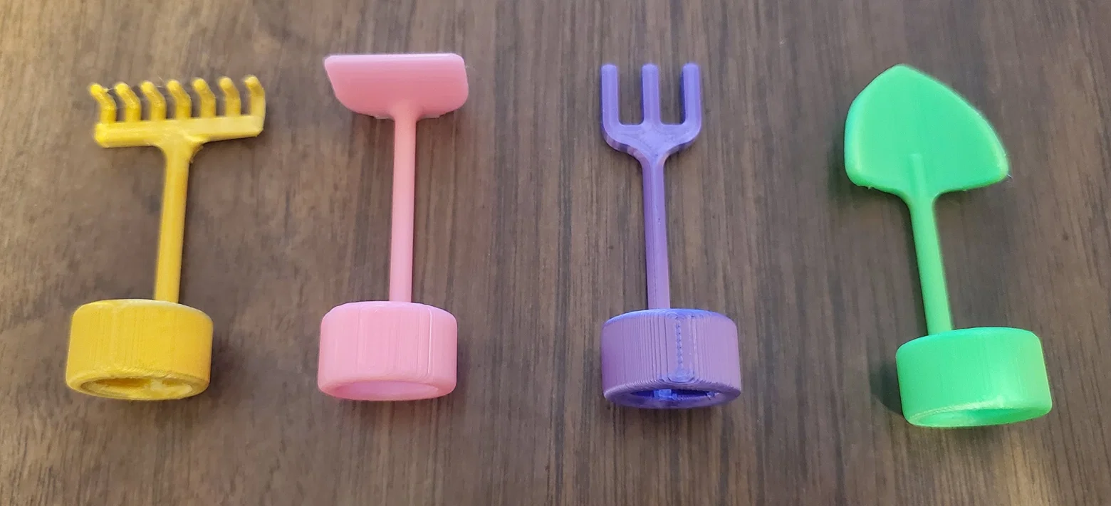 Bộ dụng cụ làm vườn mini gồm cào, cuốc, xẻng và nĩa, thiết kế độc đáo để bạn dễ dàng chăm sóc cây cảnh ngay trên đầu ngón tay. In với PLA, độ cao lớp 0.2mm và mật độ ruột 20%.