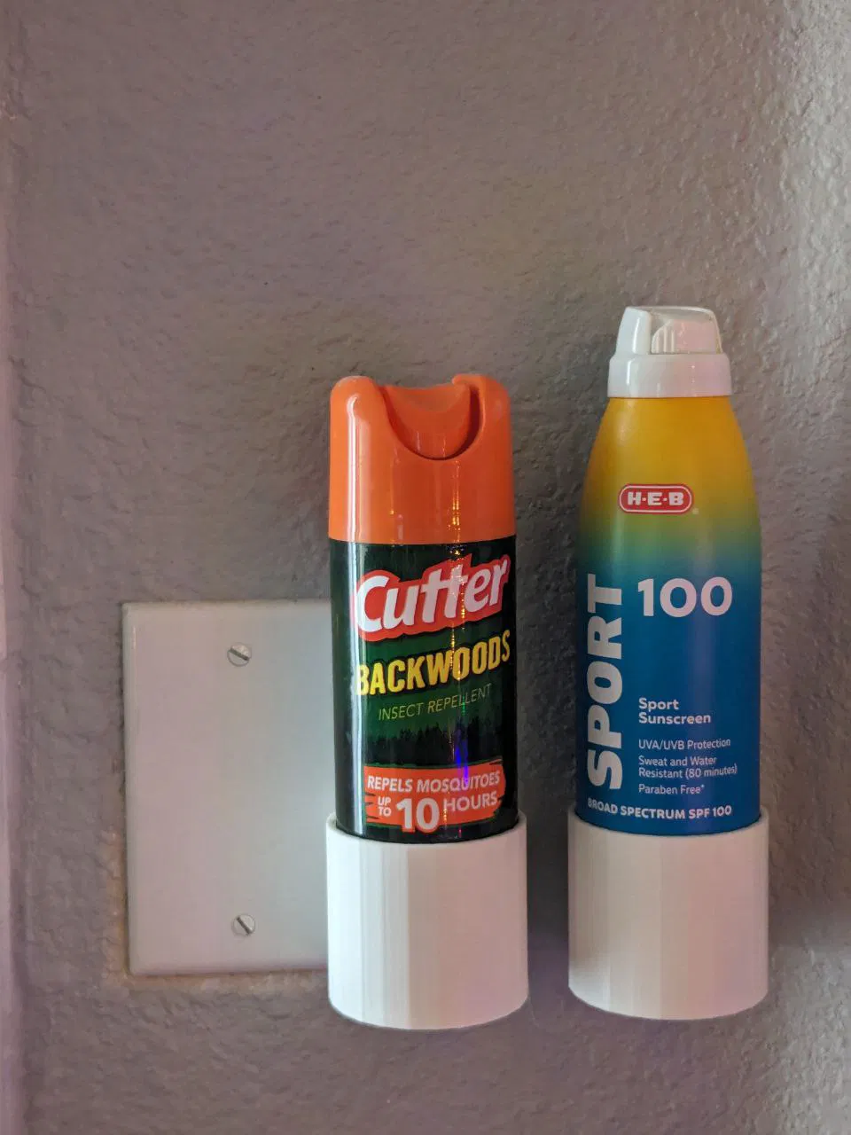 Giá đỡ bình xịt côn trùng gắn tường cực kỳ đơn giản, dùng cho các lon có đường kính 2 inch. Sản phẩm này được in bằng nhựa PLA trắng, với độ dày lớp 0.2mm và 10% infill, có thể dễ dàng gắn vào tường bằng 2 miếng dán.