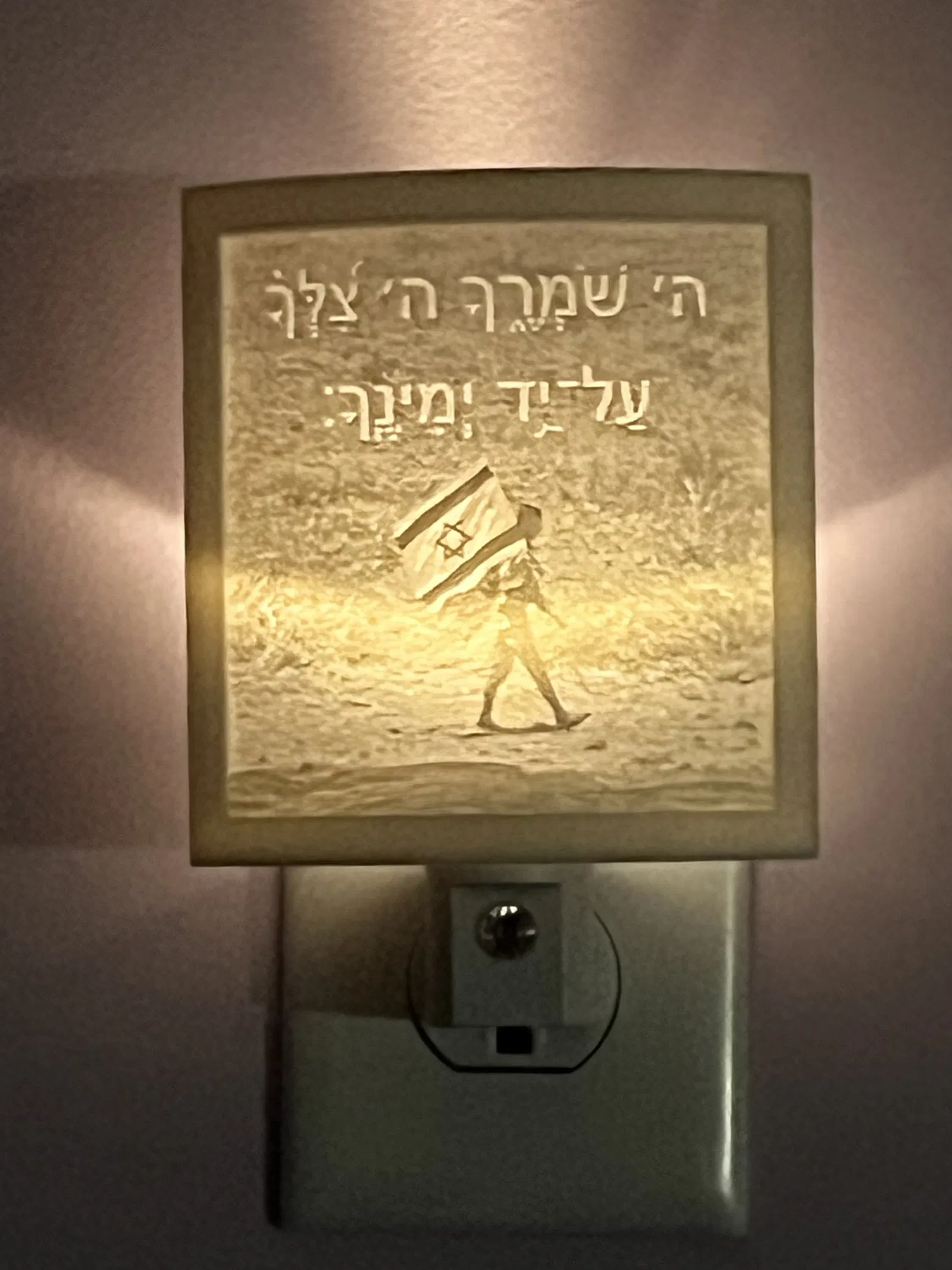 Mang ánh sáng đến cho bóng tối với bộ chụp đèn ngủ kiểu lithophane này, với hình ảnh một người lính Lực lượng Phòng vệ Israel (IDF) đang hành quân cùng lá cờ Israel, và câu Kinh Thánh "ה׳ שמרך ה׳ צלך על יד ימינך" - Chúa là Đấng bảo vệ con, Chúa là bóng mát che chở con bên hữu mình." (Thi Thiên 121:5).
