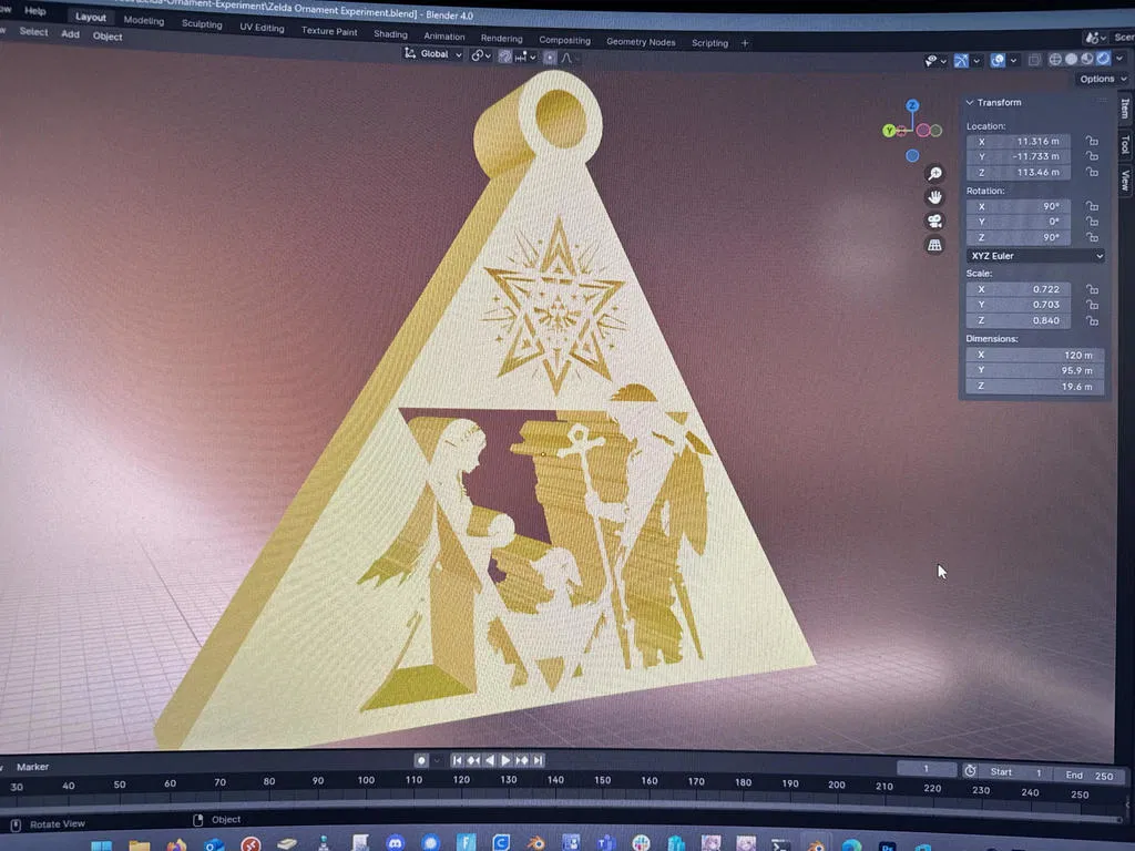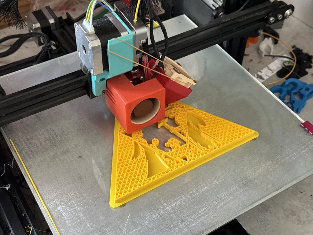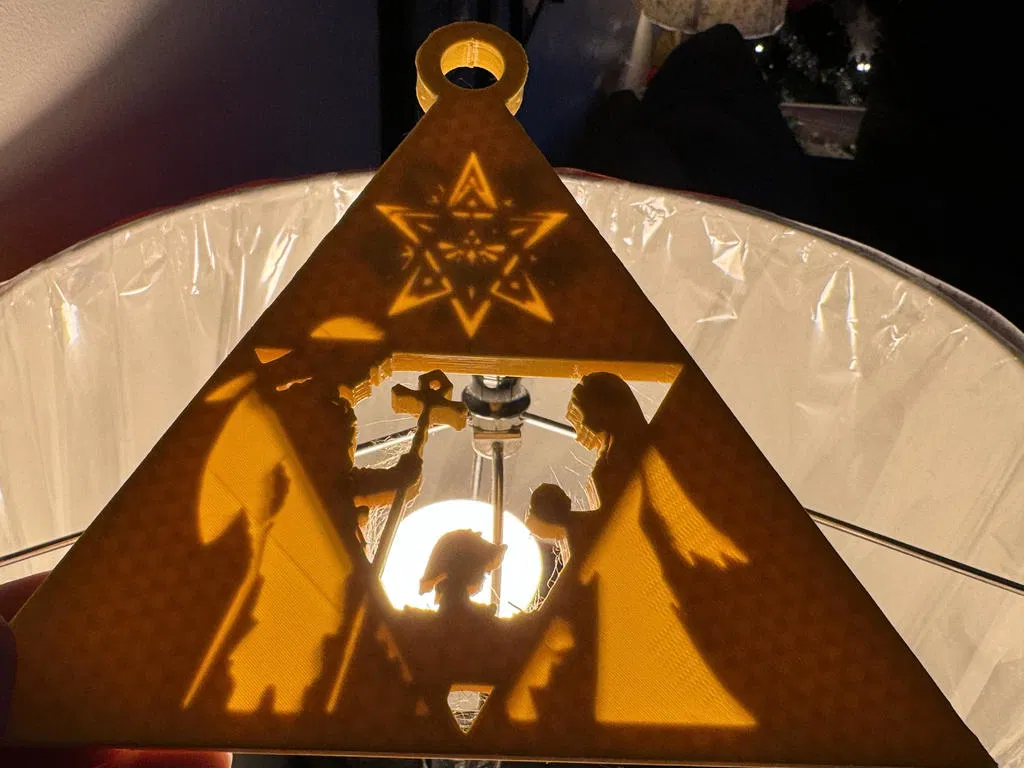 Tốn bao nhiêu là công sức mới làm xong cái này đó! Tui khoái chí lắm luôn. Bạn có thể đã thấy kỹ thuật này trên bí ngô, khoét mỏng cho ánh sáng lọt qua. Món này in mỏng ở một số chỗ để ánh sáng chiếu qua rõ hơn, giống lithophane nhưng tốn công hơn nhiều. Hộp phía sau có 9 đèn LED quấn quanh hình tam giác, chạy bằng pin 9V, có công tắc bật tắt. Tui hy vọng cái này làm hài lòng những người yêu game và đón lễ hội.