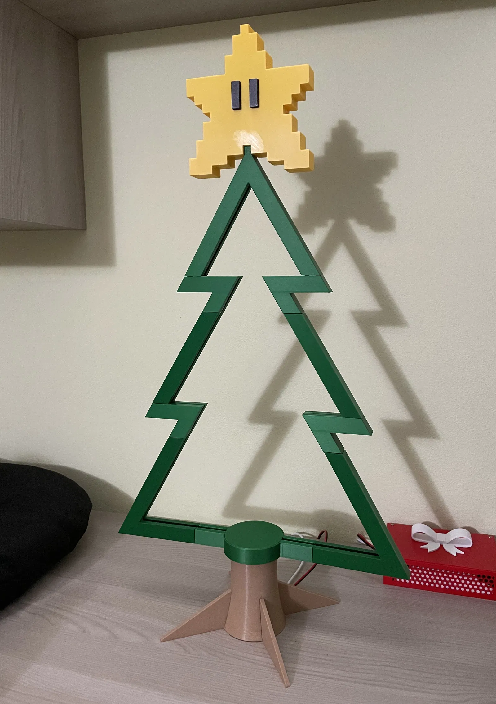 Cây thông Noel in 3D hoàn chỉnh. Nó bao gồm nhiều bộ phận, với phần sao "kiểu Super Mario" cao tổng cộng 74 cm và 61 cm nếu không tính sao. Có khe để luồn dải đèn LED, bạn cần khoảng 1.5m.