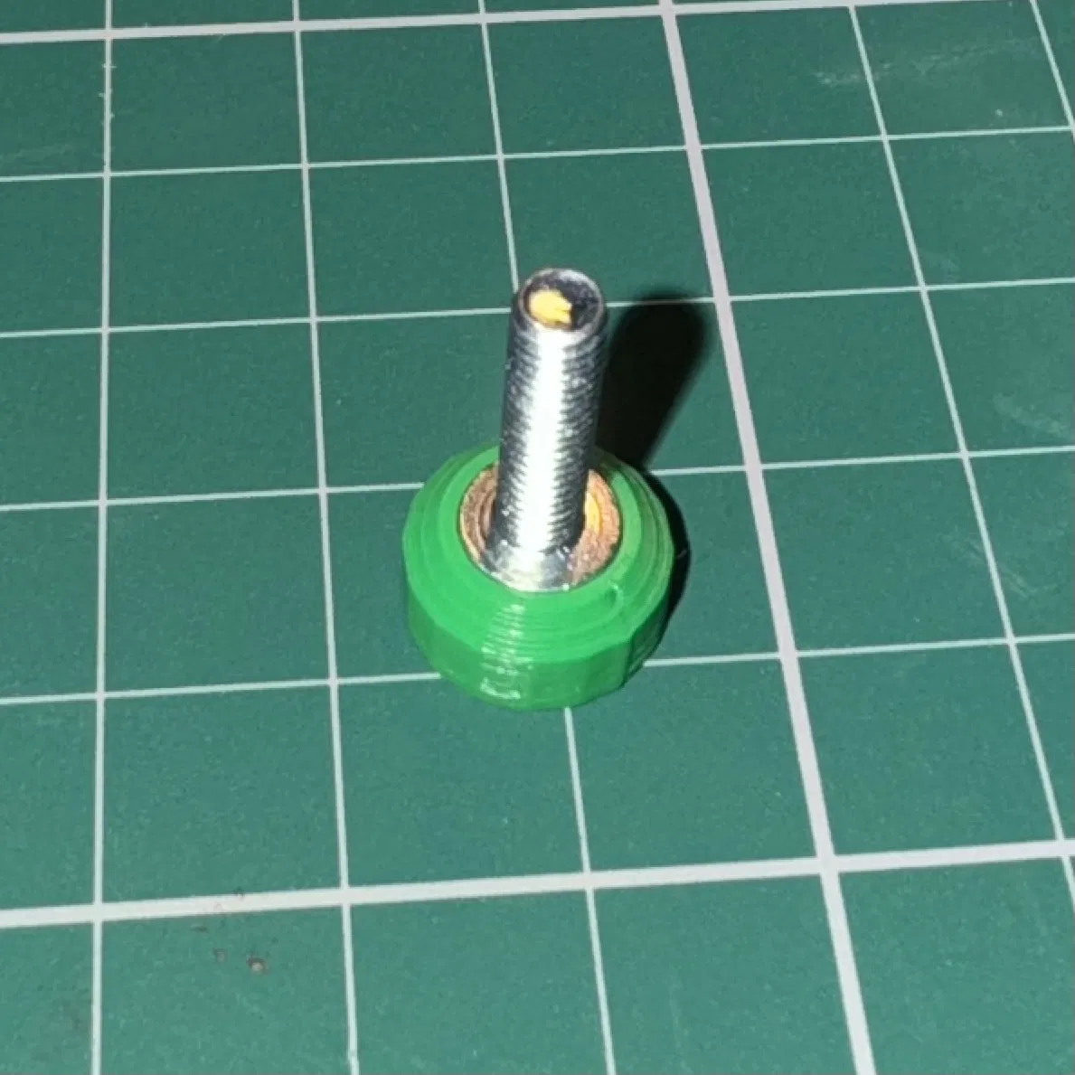 A very simple but effective thumb screw head/cap, intended to be put on top of an Allen/Inbus M4 bolt (DIN 912 / ISO 4762). I use made this one to put on some replacement bolts