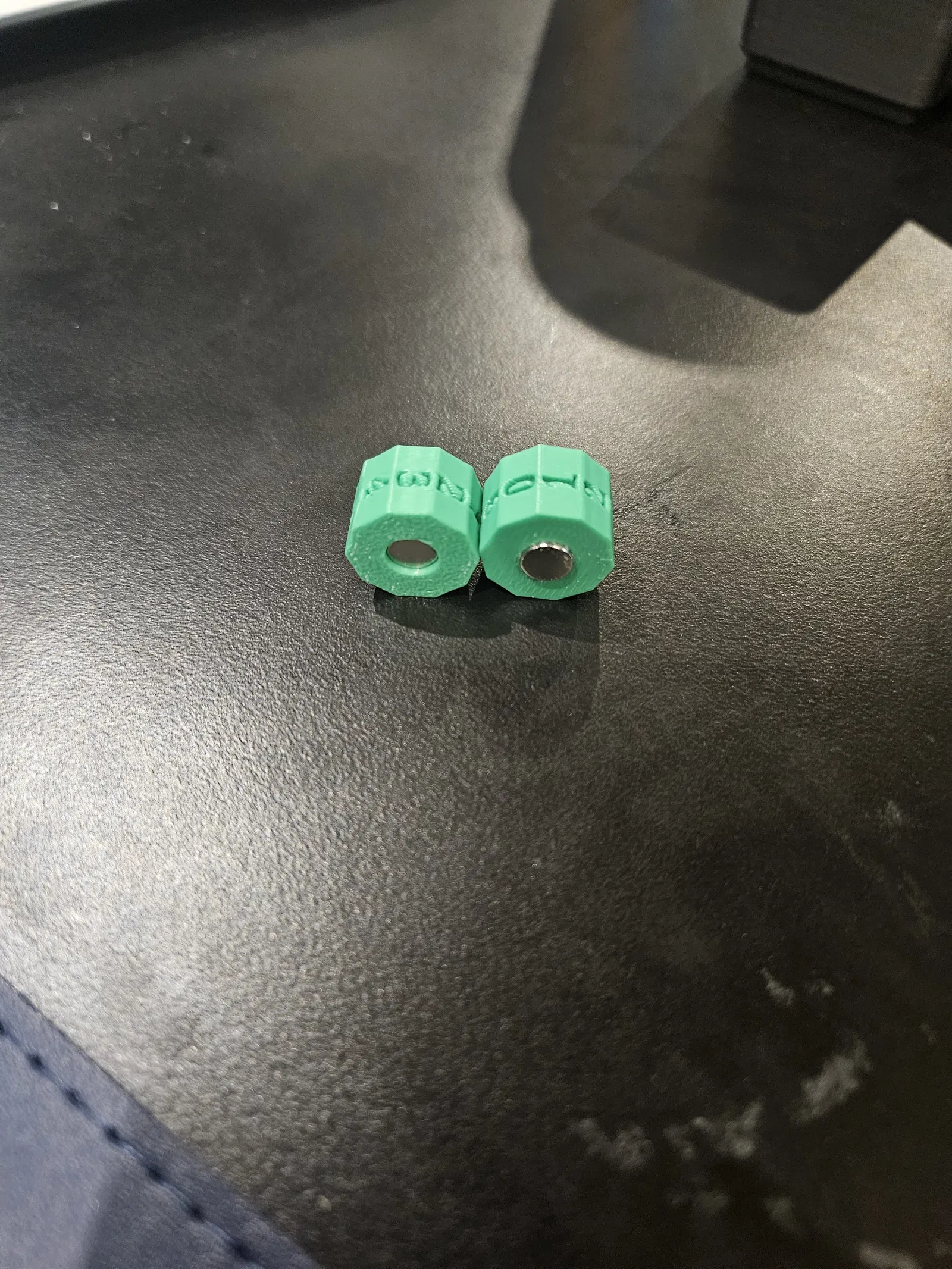Hai cục nam châm 6x2mm, một cục ở mỗi bên. Nam châm sẽ khít khi ấn vào, nhưng bạn có thể muốn thêm một ít keo cho cục nam châm ở bên trái.