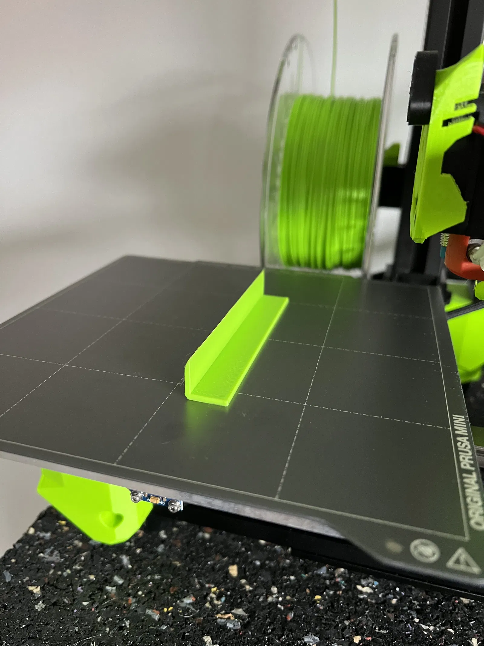 Mô hình Chống Cạnh (Kantenschutz) với kích thước 100mm x 15mm x 15mm, bo tròn và vát cạnh. Dùng để bảo vệ các cạnh máy in 3D, được in từ vật liệu PETG Lime Green, không cần support. Phù hợp với các dòng máy như RatRig, V-Minion.