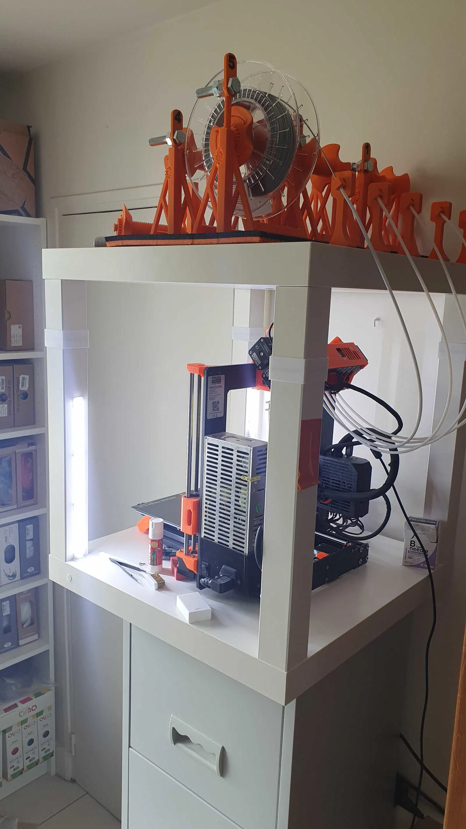 Dùng hai bàn Lack để có 5 cuộn dây cấp cho MMU2s từ trên xuống. Mấy cái chân bàn này tiện ghê, làm thùng máy in 3D cũng ngon, vừa rẻ vừa nhẹ. Nhưng chân bàn hơi ngắn, xài chung với Prusa I3 MK3 và MMU2s muốn để dây lên trên thì hơi bất tiện. Cái này nối dài chân bàn zin không cần vít, đinh hay keo.