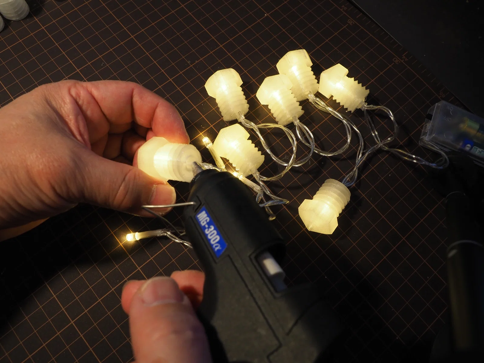 Trang trí cây thông Noel hình vòi phun đèn LED, in bằng sợi PLA hoặc PETG trong suốt, 100% mật độ.