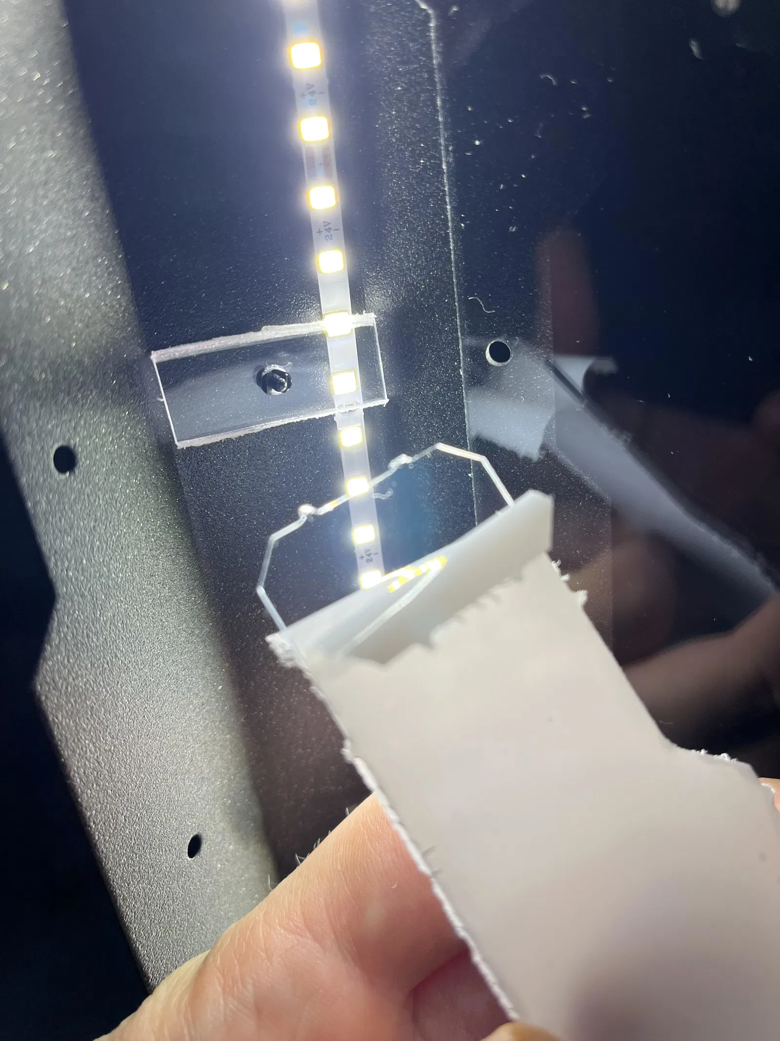 Các dải đèn LED có thể được lắp bằng các mảnh nhựa plexiglass nhỏ và dùng đinh tán (chốt đen) - xem hình ảnh. Thay vì plexiglass, bạn có thể in giá đỡ đèn LED từ: