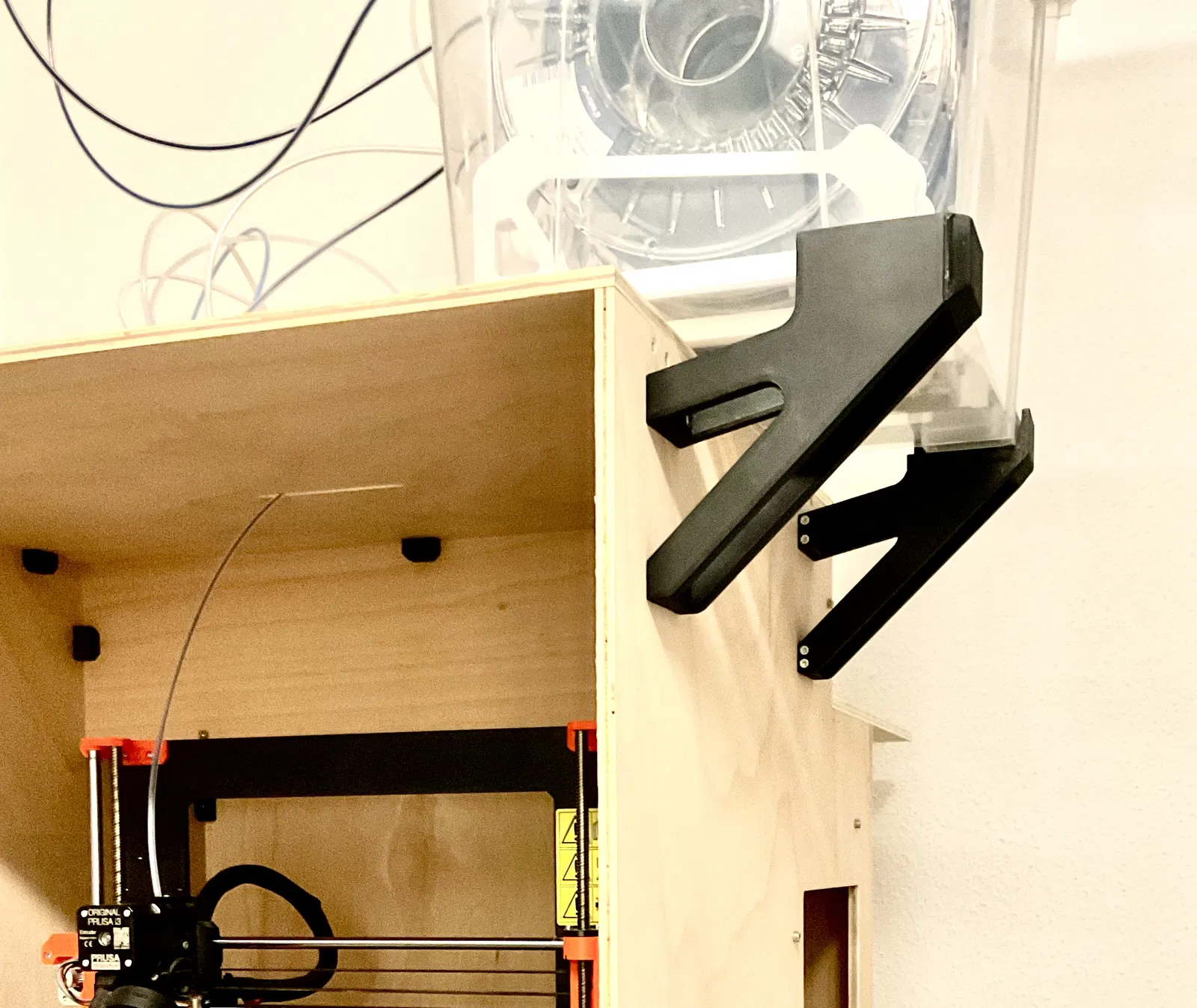 Để đặt hộp đựng sợi filament lên trên vỏ máy in 3D của bạn, tôi đã thiết kế giá đỡ này. Nó phù hợp với hộp IKEA Samla 22 lít. In bằng PETG, chỉ cần hỗ trợ một phần. Hướng dẫn in và lắp ráp chi tiết được cung cấp.