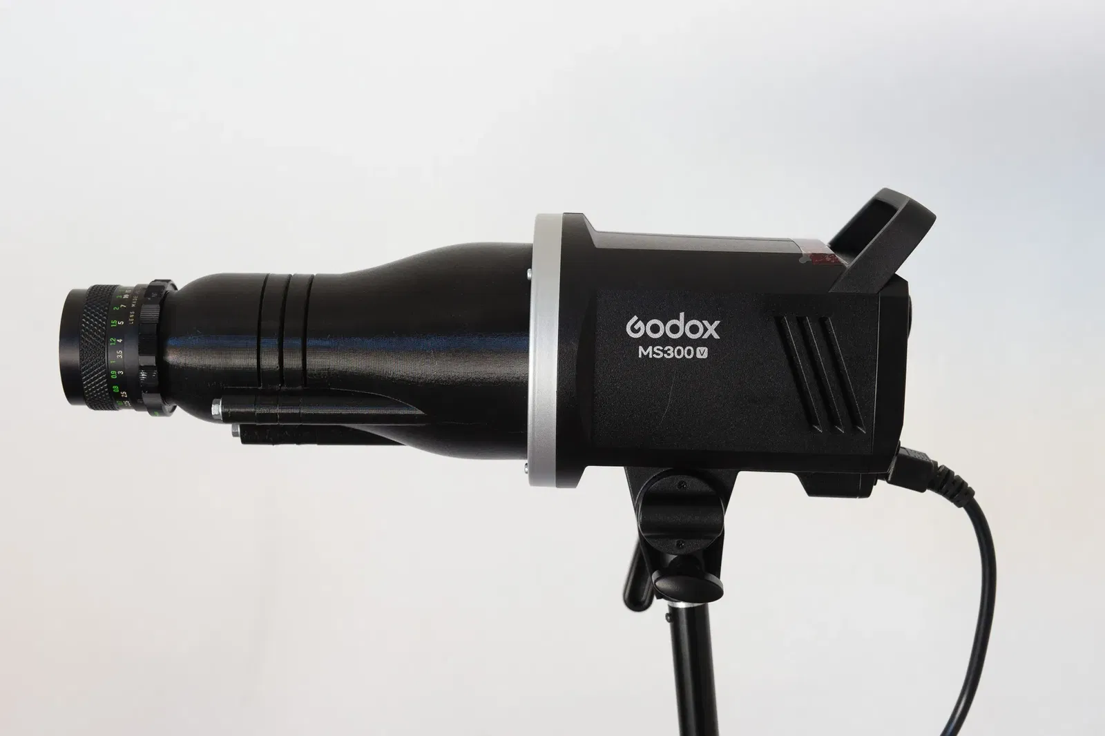 Một máy chiếu cho GoBo có thể được gắn trên bất kỳ đèn flash nào (tốt nhất là một cái có đèn LED báo, chẳng hạn như Godox MS300V). Đây là một sản phẩm cá nhân được lấy cảm hứng từ công việc của Petri Damsten () và Schweiner ()