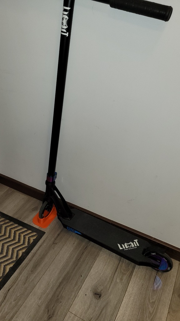 Chân chống xe scooter này giữ xe dựng thẳng áp sát vào tường, giải quyết vấn đề chiếm nhiều diện tích của các loại chân chống thông thường. Phù hợp cho bánh xe 100-120mm. Được in thử nghiệm với cài đặt 0 lớp đáy, 3 lớp trên cùng, độ mengisi 20% tam giác và hoạt động rất tốt.