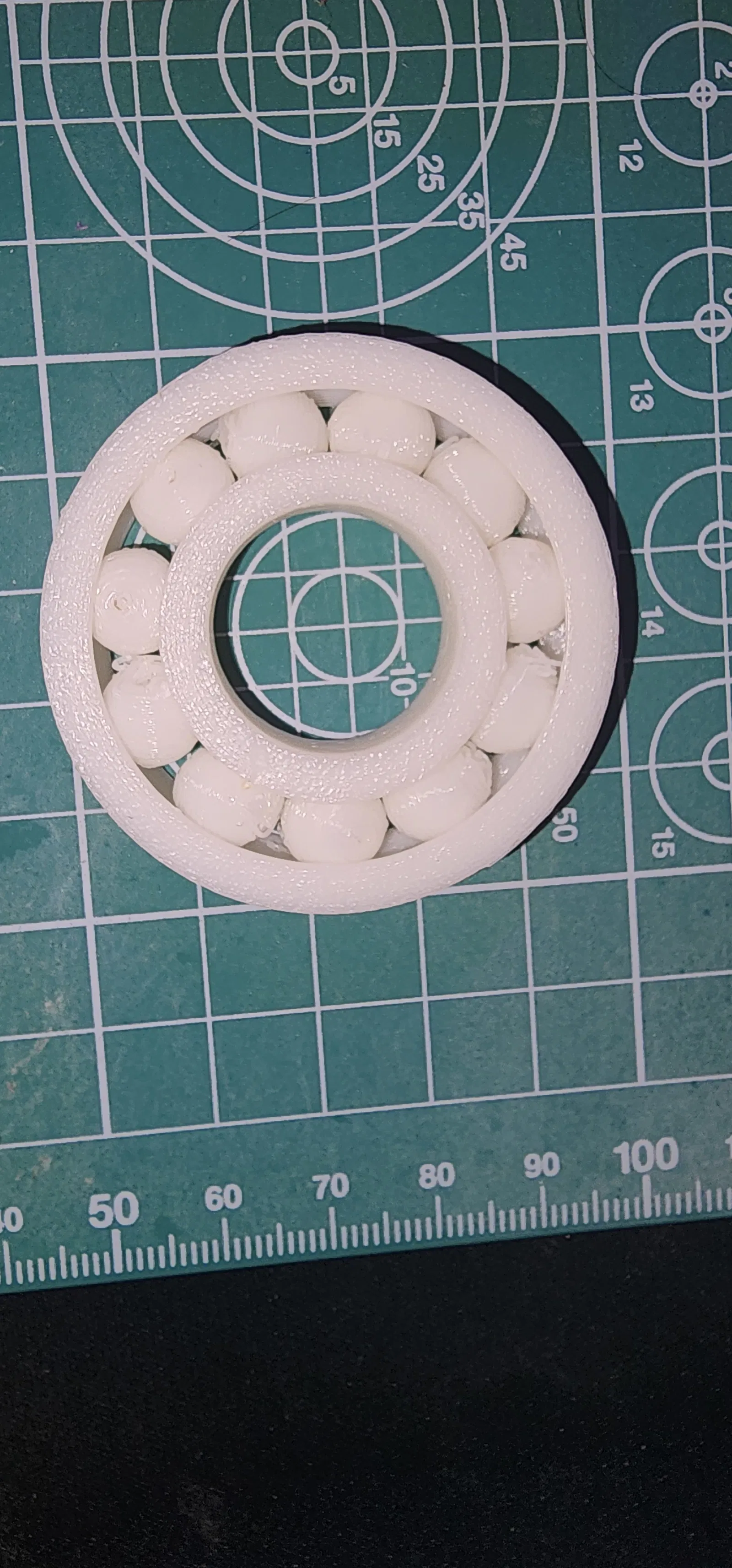 Tui đã để khoảng hở 0.6mm giữa các viên bi và rãnh bi để dễ in nha. Đường kính vòng bi là 120mm, nên chắc là anh em sẽ muốn scale nó xuống đó, tui đã scale thử xuống 50% và 25% đều ngon lành không có vấn đề gì hết.