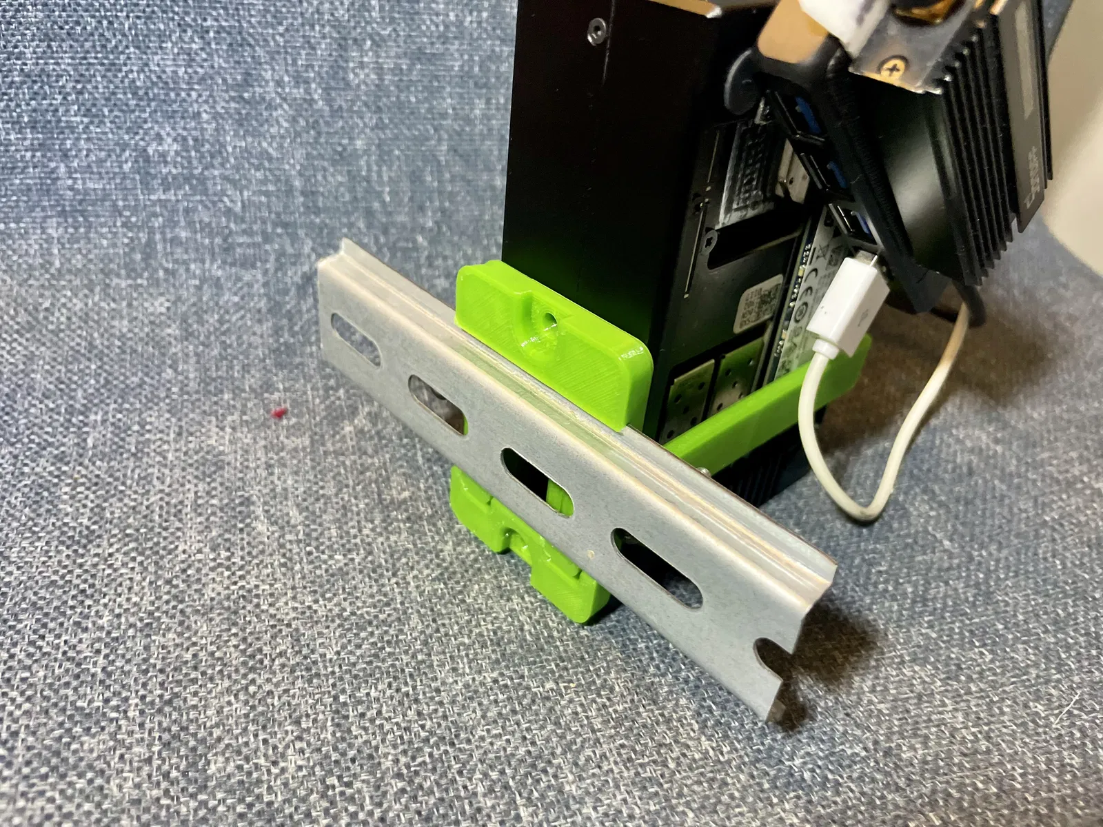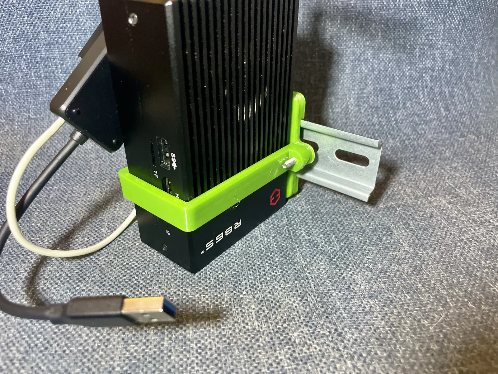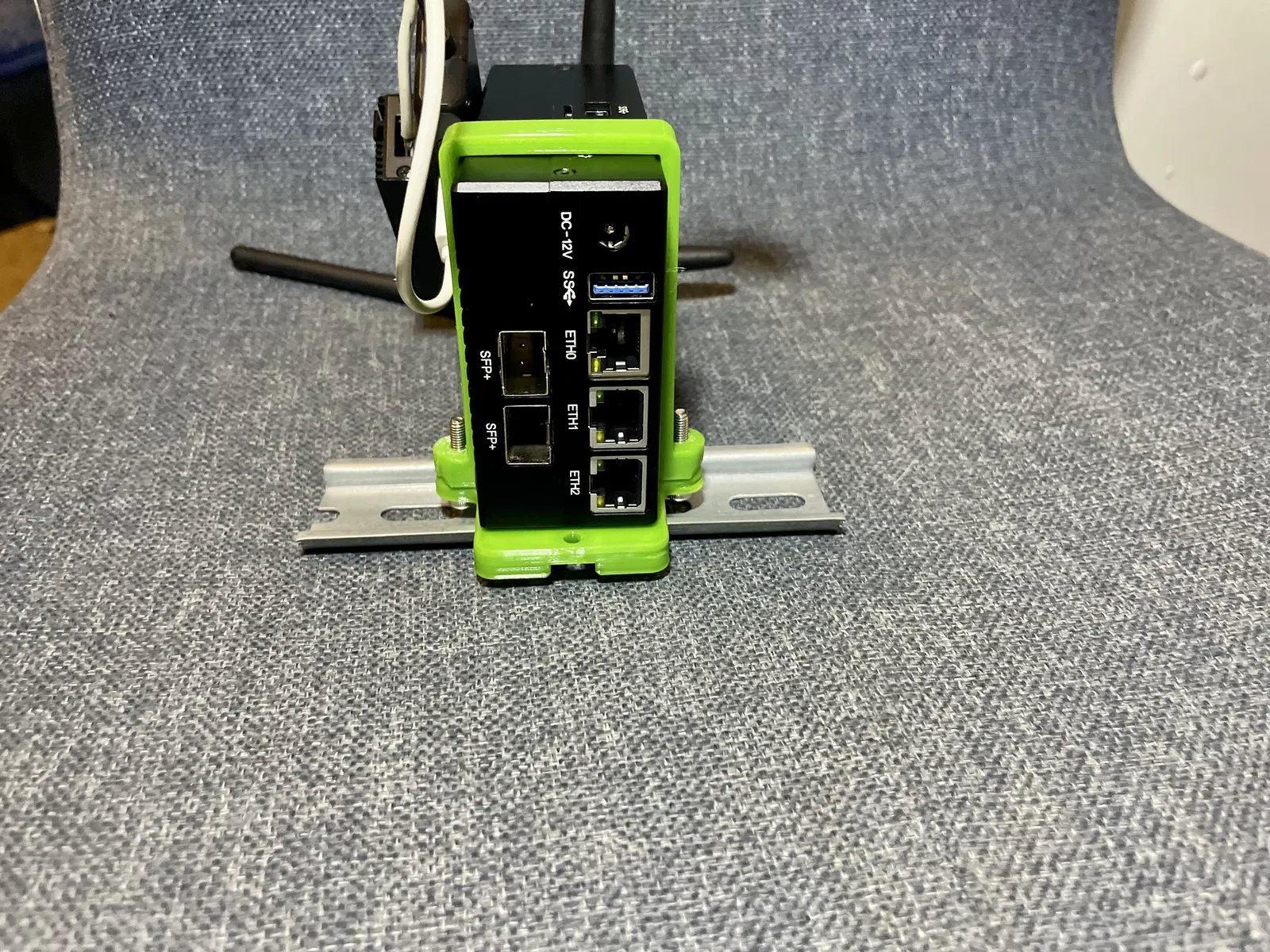 Giá đỡ này dành cho máy tính Gowin GW-R86S phiên bản dày (10GE, dòng GW-R86S-G và GW-R86S-U) gắn trên thanh ray DIN. In bằng PETG với 2 ốc M4 và vòng đệm. Đảm bảo không che cửa hút gió và nút nguồn.