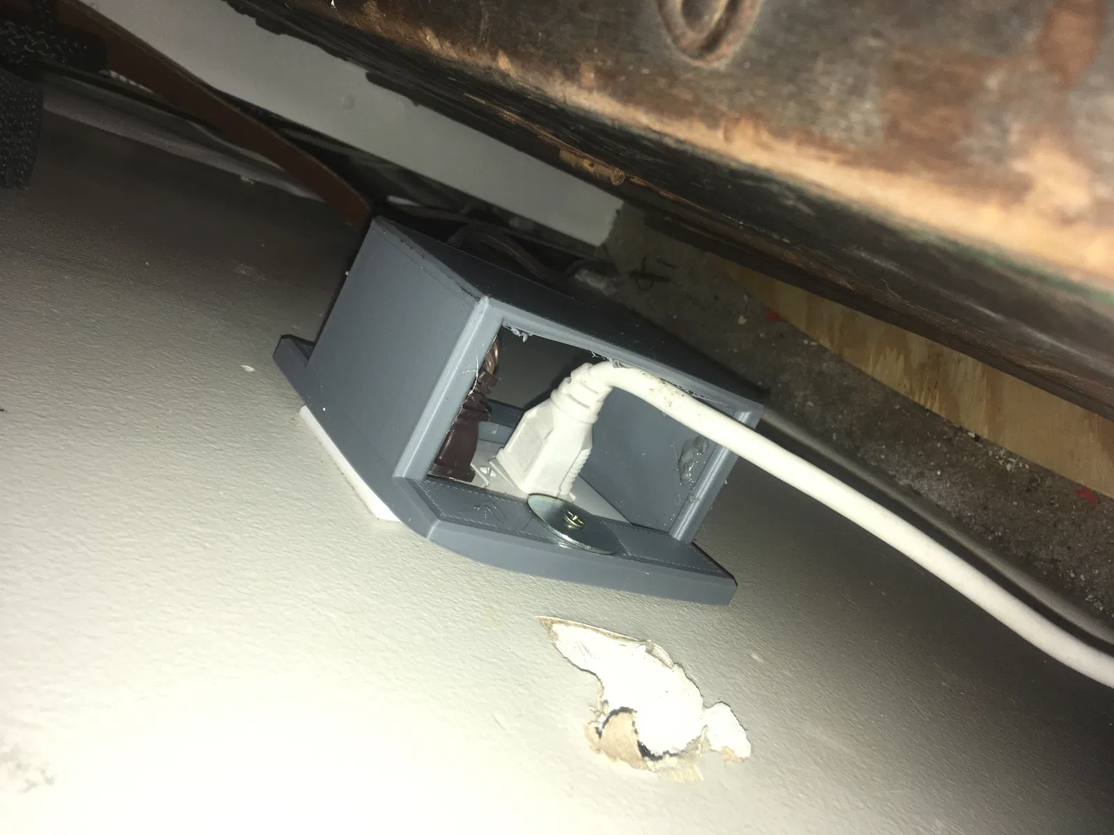 Một cái ốp ổ cắm đơn giản, thiết kế cho kiểu ổ cắm ở Mỹ. Cái này giúp giữ chặt dây điện, tránh bị tuột ra ngoài, rất tiện để giữ dây nguồn máy in không bị ngắt đột ngột.