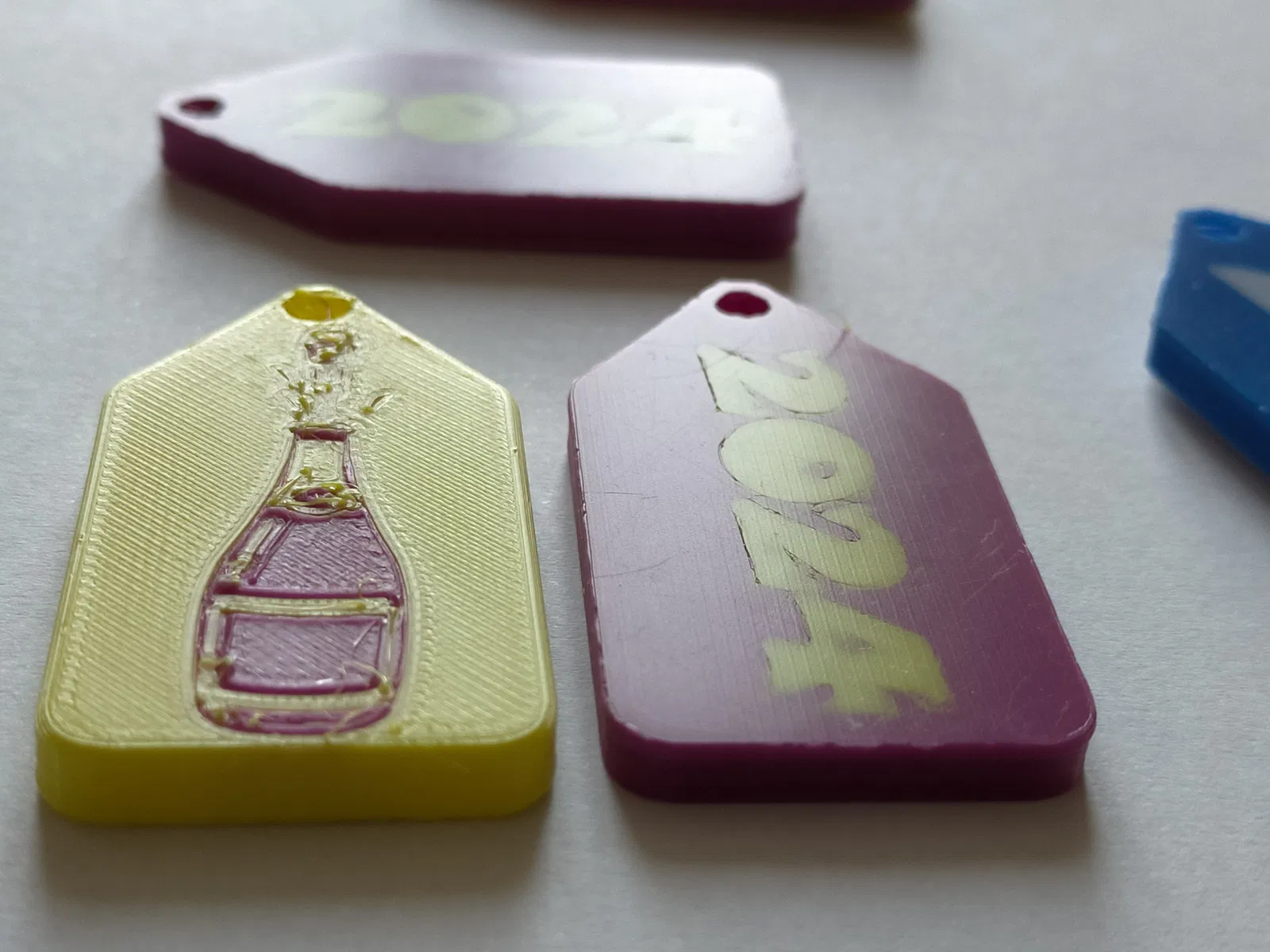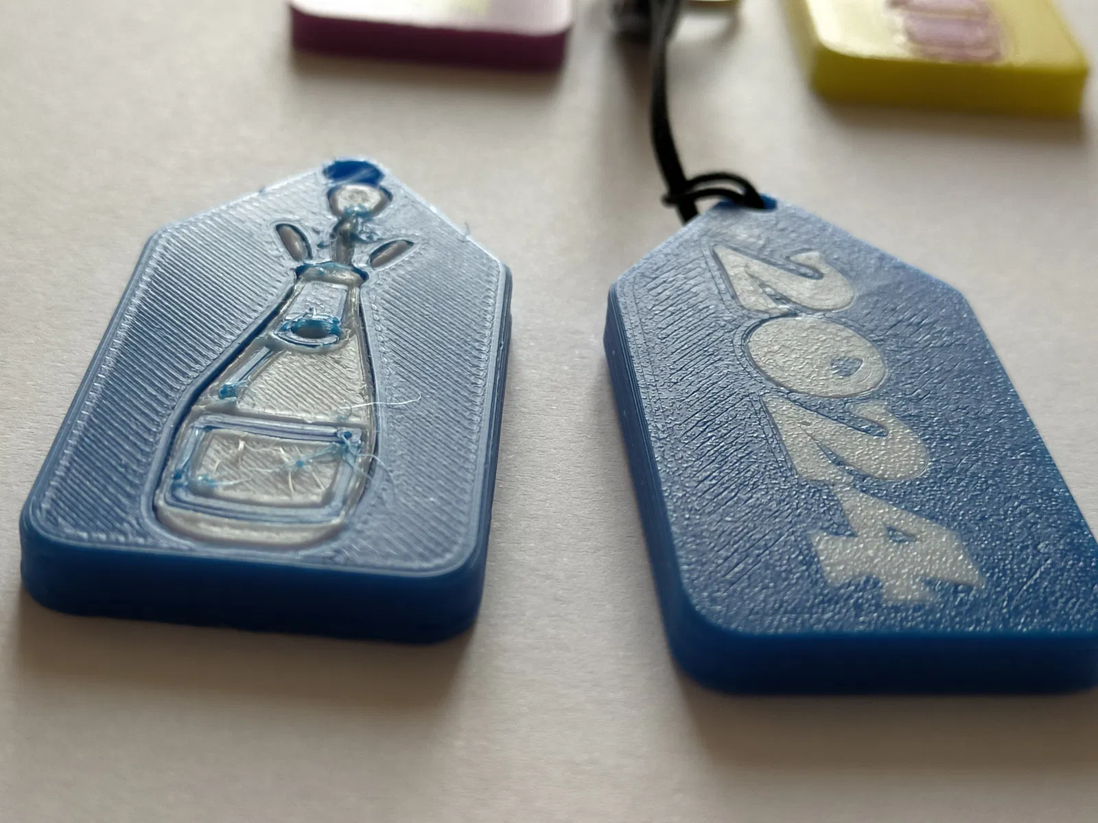 Mẫu móc khóa 2024 đa sắc, có hình chai, được in không cần MMU và không có relief. Hướng dẫn chi tiết cách in phần chữ và thân chai, cùng các tùy chọn khác nhau cho chai và thân móc khóa.