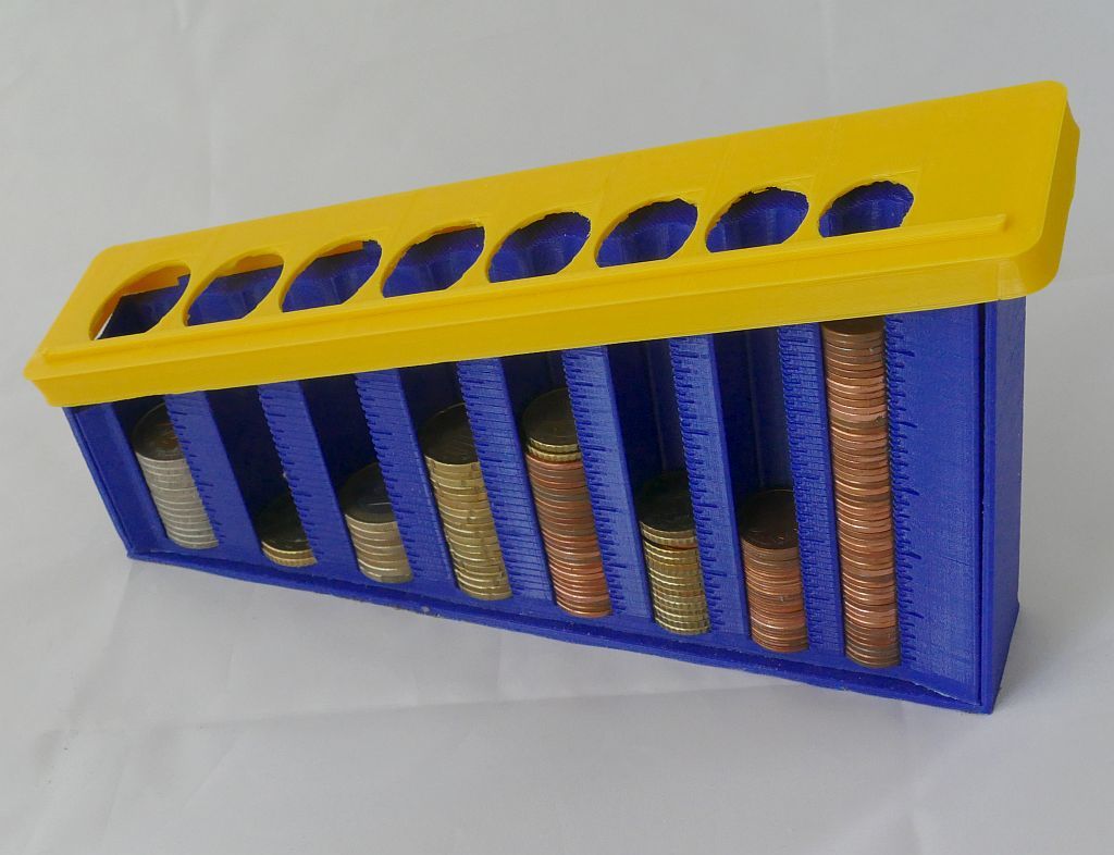 - Có tùy chọn thanh chắn cao và thanh chắn phía sau để hỗ trợ việc nạp xu nhanh chóng và chính xác. ### Cách sử dụng Máy phân loại tiền xu tự động cho nhiều loại tiền tệ. Xem thêm tại http://youtu.be/7F2fIF9PNBk để xem video demo ngắn về phiên bản gốc. Để cất xu, bạn thả đồng xu từ trên cùng bên phải xuống, nó sẽ trượt xuống dốc và đi vào khe phù hợp trong giá đỡ. ### In ấn Tất cả các bộ phận đều có thể in dễ dàng mà không cần hỗ trợ, ngoại trừ mặt trên. Mặt trên có thể in theo một trong hai cách: a) có hỗ trợ b) chia đôi theo chiều dọc để có hai phần in không cần hỗ trợ, sau đó dán lại với nhau. Mặt trên có thể cần được đặt chéo để tận dụng tối đa diện tích in. Phiên bản EUR sẽ vừa với bàn in 210 mm x 210 mm. Tất cả các phiên bản khác đều nhỏ hơn, ngoại trừ phiên bản PLN, phiên bản này sẽ yêu cầu thêm một đoạn dài tùy chỉnh cho mặt trên. Điểm mới trong V7.4: Hộp đế có thể in đứng, nhanh hơn, tốn ít vật liệu hơn và phù hợp với các bàn in nhỏ hơn. ### Tiền tệ Danh sách các phiên bản tiền tệ có sẵn: * ARS - Đồng Peso Argentina