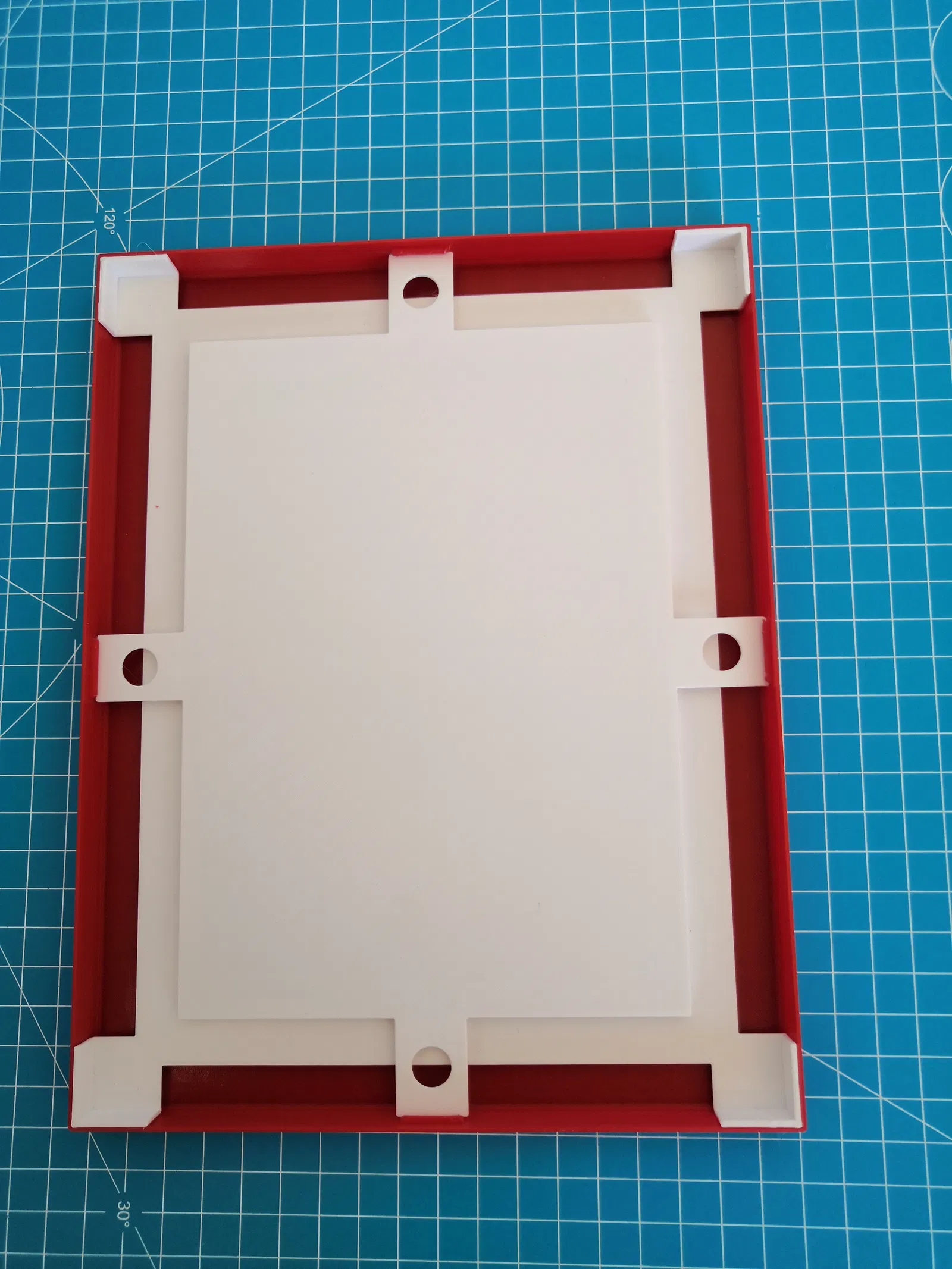 Khung ảnh với viền giấy, kích thước 17.8cm x 12.7cm. Tui đã thiết kế lại bằng FreeCAD, đảm bảo các khoảng cách đều nhau và lắp ráp đơn giản. Chỉ cần đặt viền giấy từ phía sau rồi cố định ảnh bằng mặt lưng.