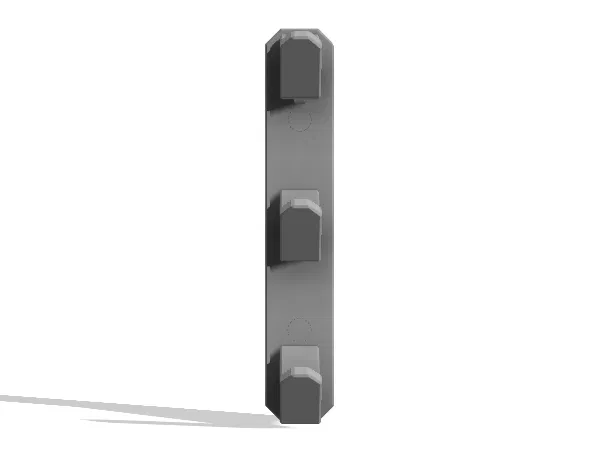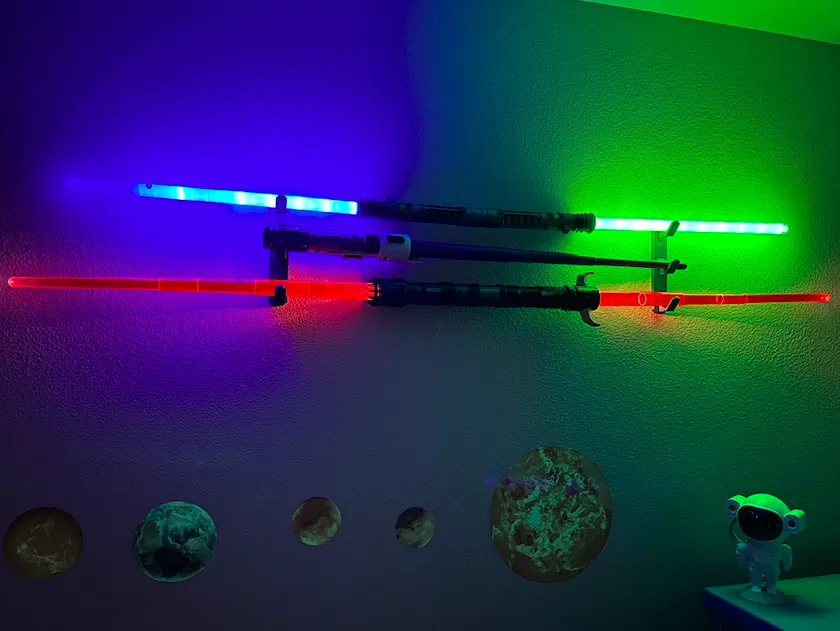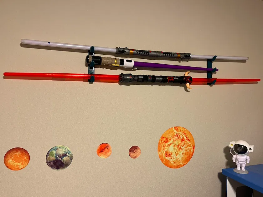 Giá đỡ kiếm ánh sáng gắn tường. Có hai tùy chọn lắp đặt: có hoặc không dùng vít (tức là dùng băng dính hai mặt). Bản in của tôi dùng đầu phun 0.4mm, độ phân giải 0.2mm, độ lấp đầy 20%, không cần hỗ trợ với nhựa PETG màu xanh lá cây đậm.