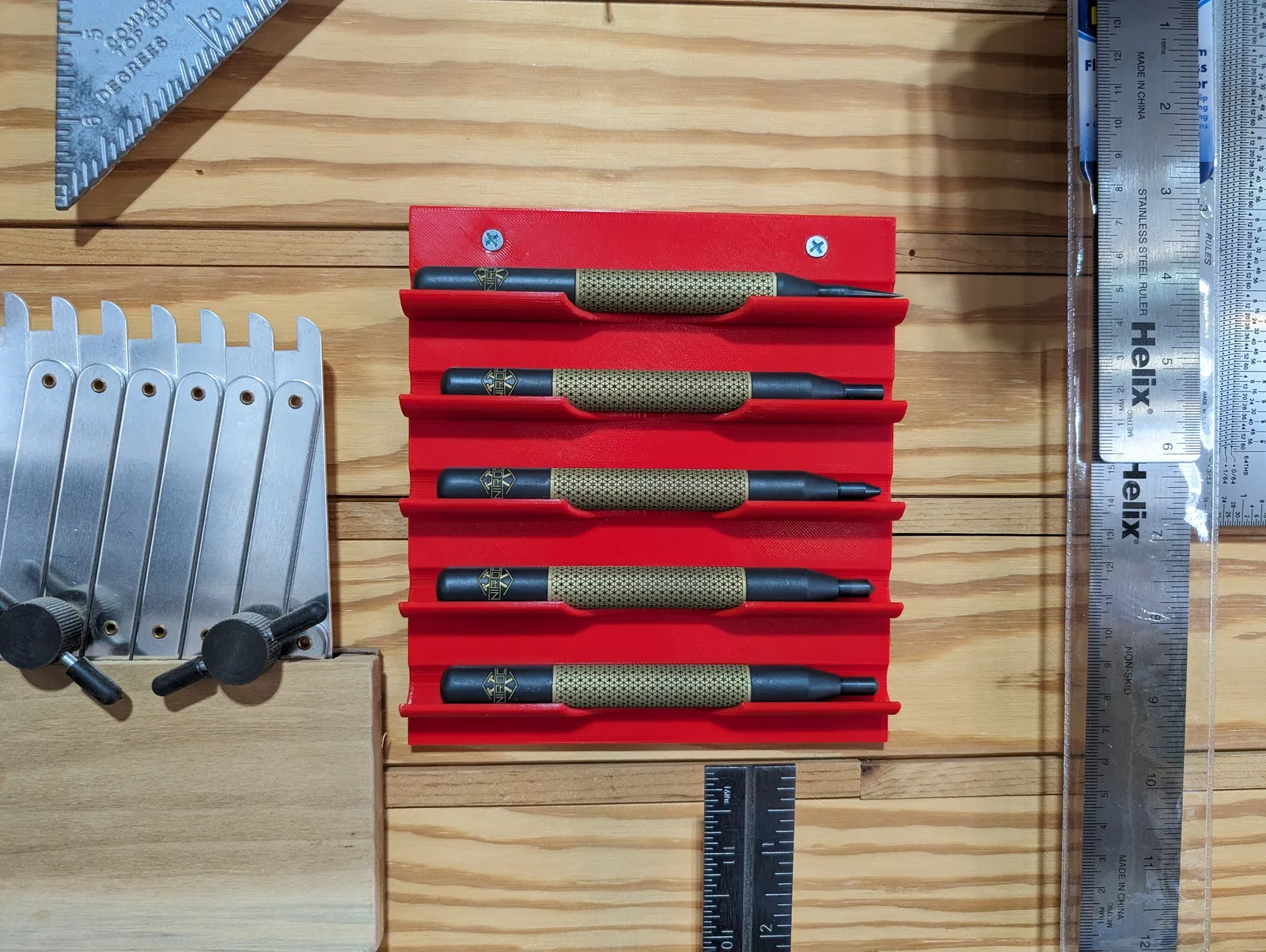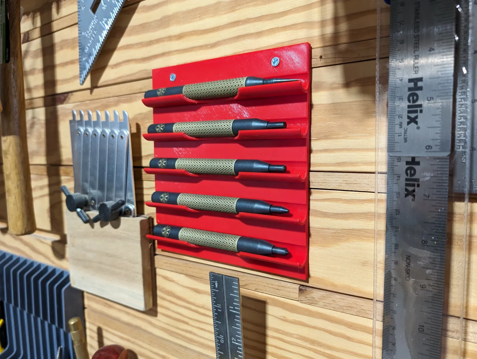 Tui tạo cái mẫu này để giữ bộ Niroc punch của tui, mà tui đặt hàng từ https://www.niroc.com.au/, trên tường dụng cụ của tui. Tui in nó nằm phẳng ra, không cần hỗ trợ.