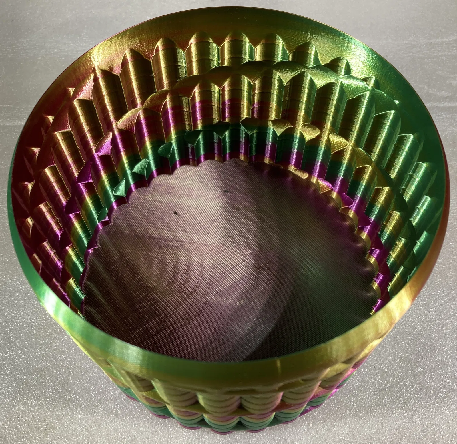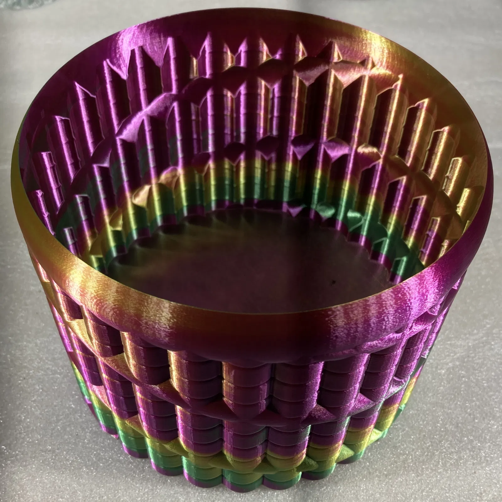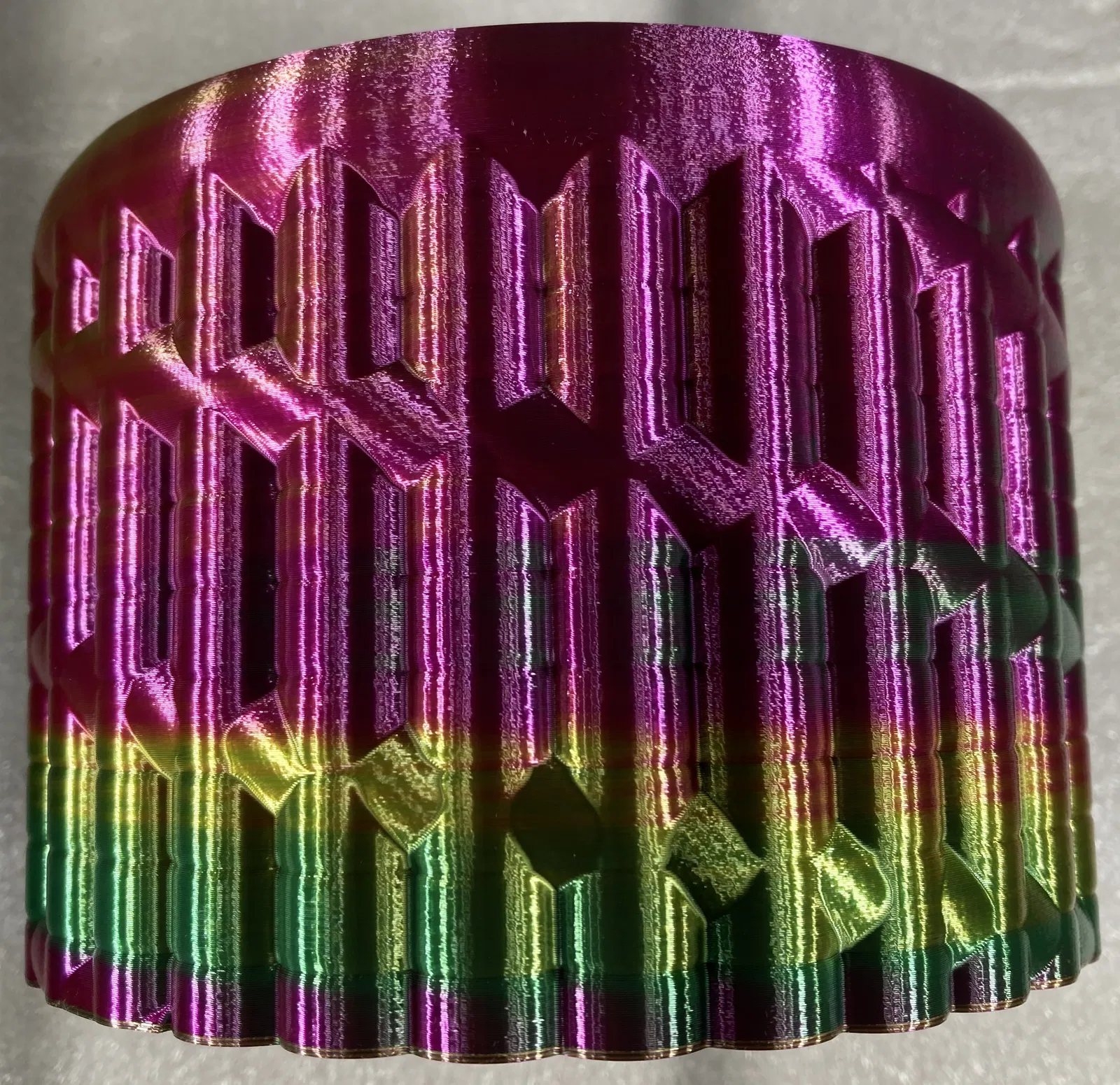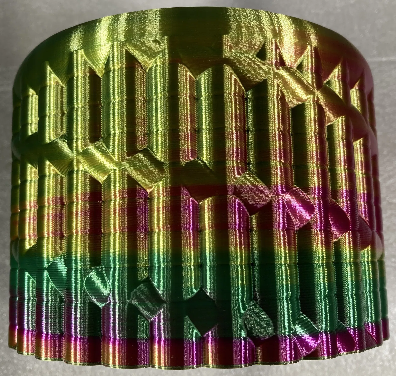Tôi đã in nó bằng bộ phận xoay cuộn dây của mình (/3d-model/bo-xoay-cuon-filament-nhieu-mau-cho-may-in-3d) sử dụng sợi nhựa Amolen ba màu ép đùn. Các màu sắc chạy theo hình xoắn ốc quanh bình – chỉ có một dải màu liên tục cho mỗi màu.