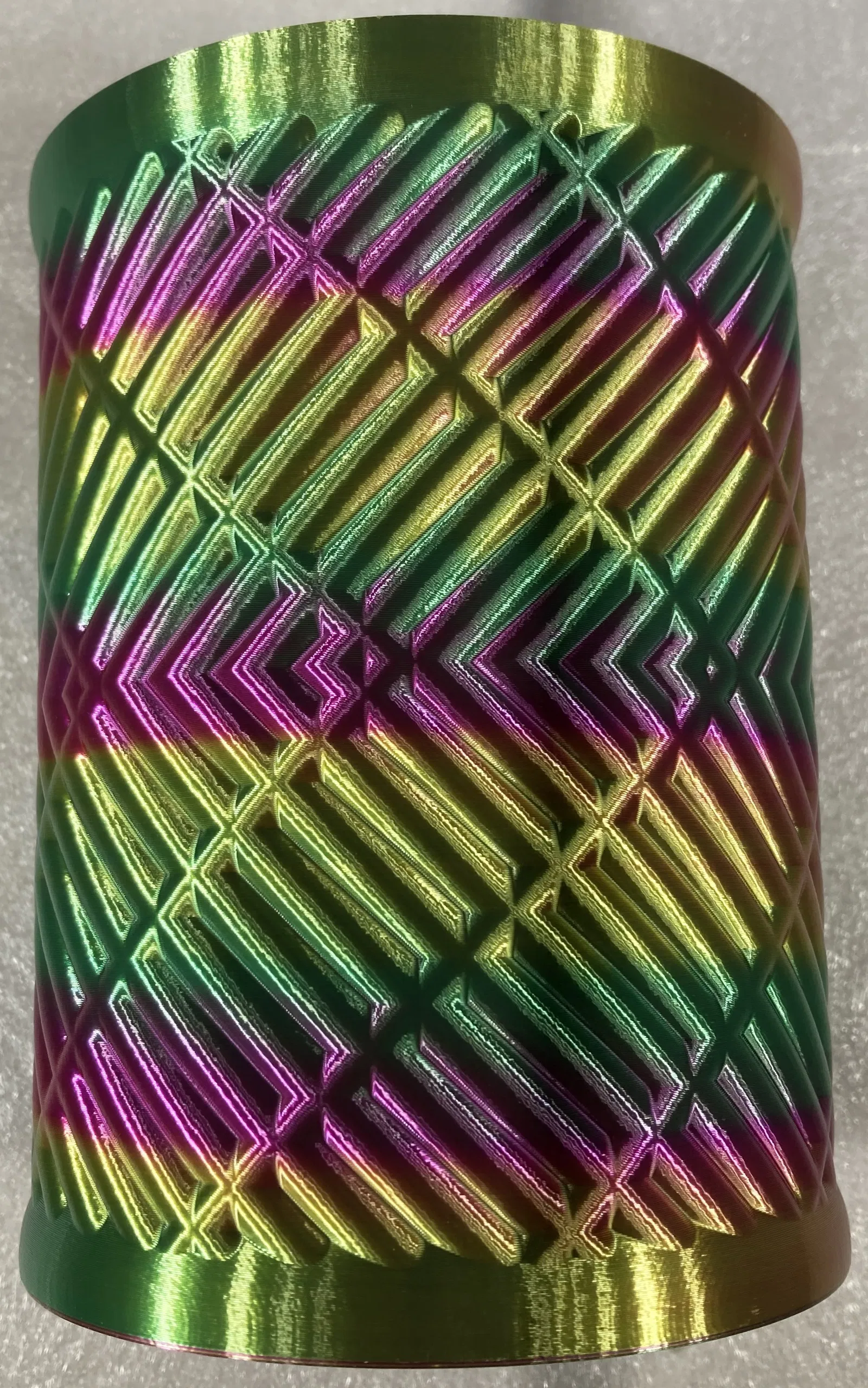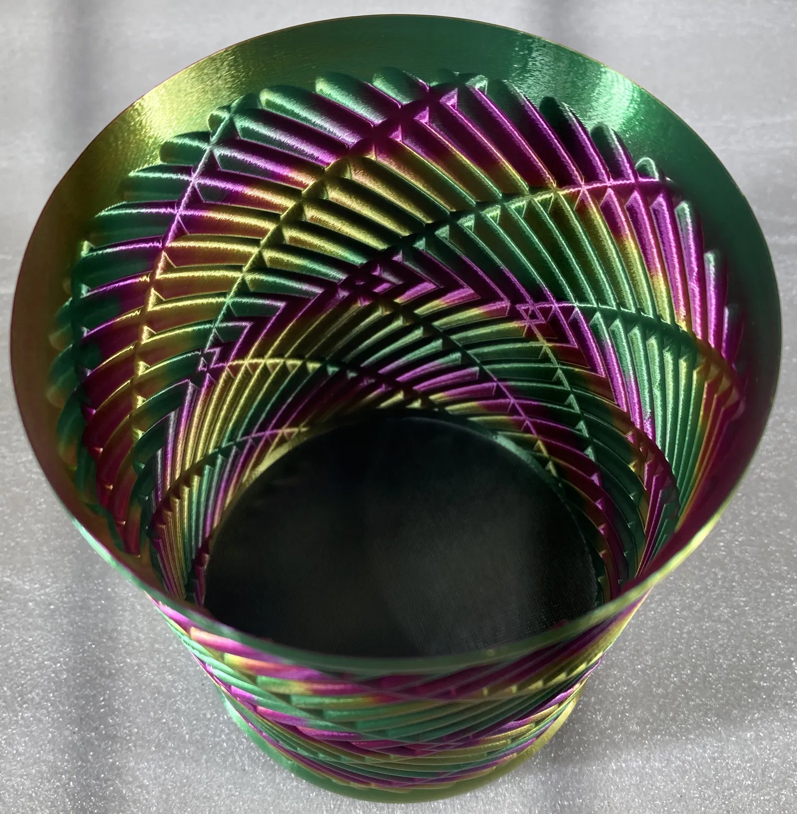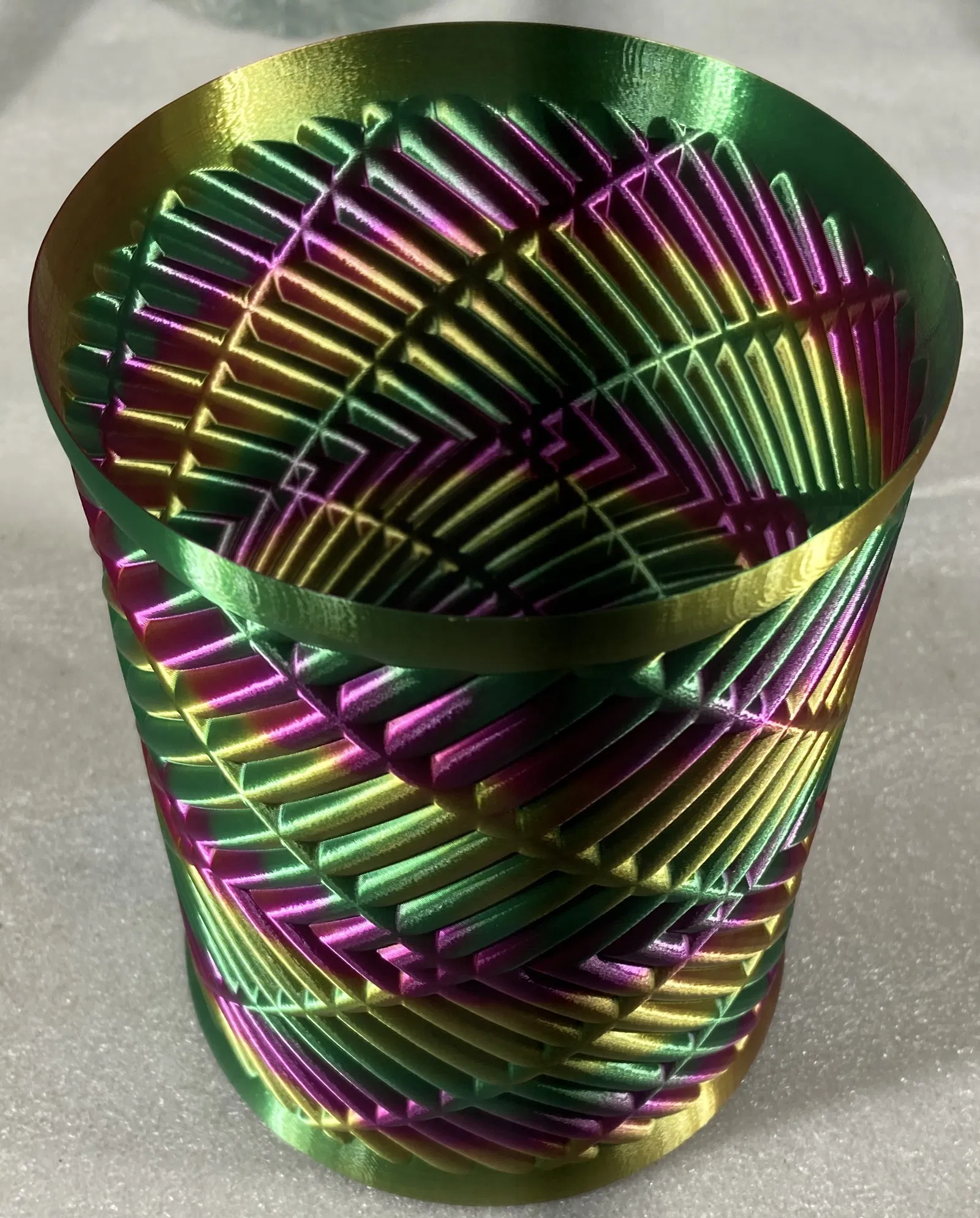 Nó được in bằng con quay cuộn chỉ của tui (/3d-model/bo-xoay-cuon-filament-nhieu-mau-cho-may-in-3d) sử dụng sợi nhựa Amolen co-extruded ba màu. Màu sắc chạy xoắn ốc quanh cái lọ – chỉ có một sọc liên tục của mỗi màu thôi à.