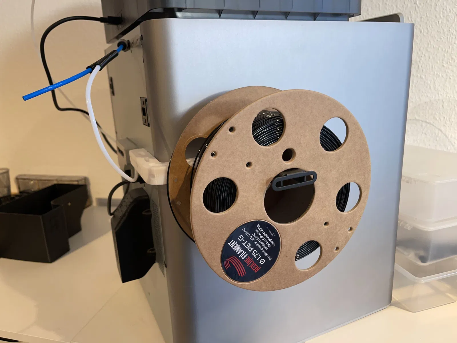 Dựa trên thiết kế tuyệt vời của @RolandDeschain, tôi đã điều chỉnh một chút cho giá đỡ cuộn này để hấp thụ các lực bên mà một cuộn filament 1 kg có nhiều hơn qua tường bên của máy in. Thêm vào đó, tôi đã xem xét một miếng dán hai mặt, vì vậy điều này giờ đây nên ổn định đúng cách.