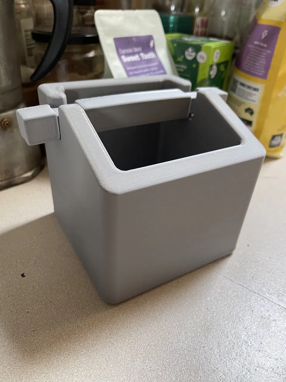 Hộp gõ bã cà phê cứng cáp hơn, to hơn để bạn gõ bã cà phê một cách dễ dàng. Có nhiều chỗ trống cho bã cà phê sau khi gõ.
