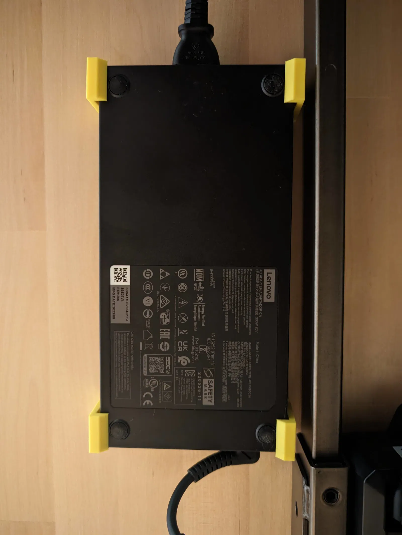 Giá đỡ cục sạc, dùng được cho cả cục sạc Lenovo và HP. Tui muốn cái gì đó in nhanh không cần support, nên tui sửa lại thiết kế, chỉ cần in hai cái đầu là chạy ngon, cứng cáp lắm.